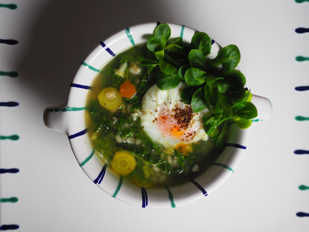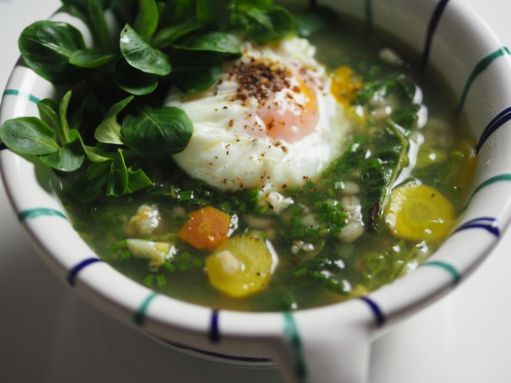 Rollgerstl drei Stunden im kalten Wasser einweichen. Abgießen und dann in Salzwasser etwa 15 Minuten kochen. Währenddessen die Pastinaken, die Petersilienwurzel und Karotten schälen und in Scheiben schneiden, den Wirsing in Streifen schneiden und in einem Topf in Olivenöl anrösten. Mit Gemüsebrühe aufgießen. Abgießen und zur Gemüsebrühe geben. Die Eier pochieren wie hier. Die Suppe anrichten mit pochiertem EI und Vogerlsalat servieren.