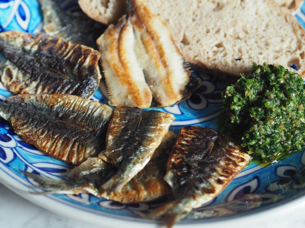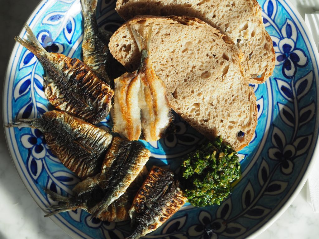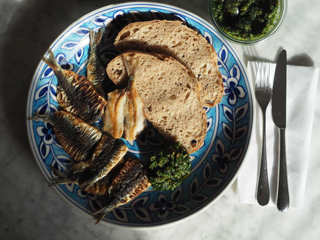Der Sommer kehrt zurück: es gibt Sardinen mit Picada und Brot. Wir sind zwar schon im Herbst, aber heute hat es noch mal aufgerissen zu Mittag und es hat sensationelles Wetter gegeben. Der Sommer kehrt zurück, und wir haben ihn auf unserem Tisch aufleben lassen: Es gibt Sardines papillon mit picada einer Gewürzgrundlage aus viel Knoblauch und Petersilie. Dazu Sauerteigbrot, das Bauernbrot von Motto.