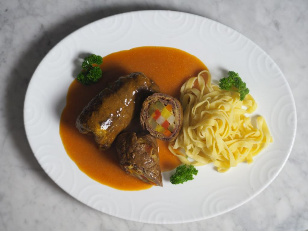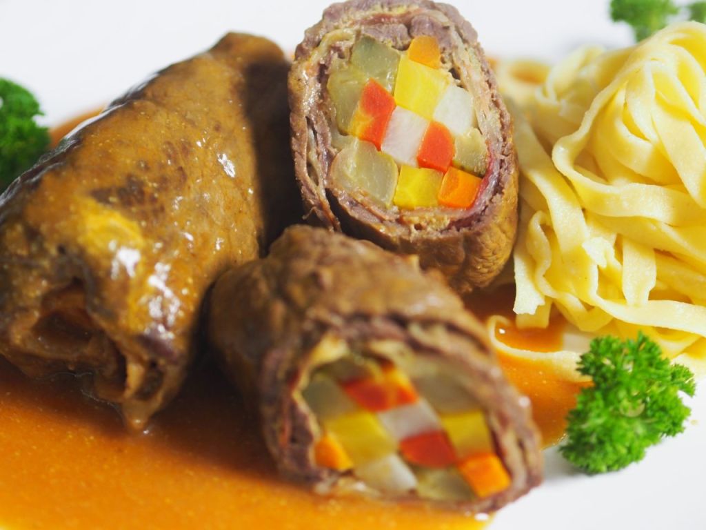 Rote, gelbe orange Karotten Petersilienwurzel Stück Sellerie Essiggurken in Stifte schneiden. Gleichmäßig geschnittene Oberösterreichische Rindsrouladen à 120 Gramm salzen pfeffern mit Senf bestreichen mit vier Scheiben Mühlviertler Speck belegen, Gemüse- und Essiggurkerl-Stiferln nach Lust und Laune auf den Speck legen. Die Rindsrouladen kompakt zusammenrollen. Mit Küchengarn verschnüren. In einer Bratpfanne Butterschmalz erhitzen. Rouladen von allen Seiten anbraten aus dem Bräter nehmen auf die Seite stellen. Eine große grob gehackte Zwiebel in den Bräter geben und das vom Stifteln übrig gebliebene Gemüse dazu geben anbraten. Zwei Teelöffel Tomatenmark einrühren kurz mitbraten und mit Rinderbrühe aufgießen. Drei Lorbeerblätter sechs zerdrückte Wacholderbeeren und 10 Stück Pfefferkörner plus vier zerdrückte Knoblauchzehen in die Sauce geben. Die Rindsrouladen wieder zurückgeben und zugedeckt im Backrohr bei 160 Grad zirka 1 Stunde 20 garen. Aus dem Backrohr nehmen. Die Rouladen herausnehmen den Küchengarn entfernen. Abdecken, damit es schön warm bleibt. Die Sauce abseihen. Mit zwei Teelöffel Crème fraîche und Maisstärke binden. Die Rouladen wieder in die Sauce geben und durchziehen lassen. Nudeln 130 Gramm Weizengrieß mit einem Dotter und soviel Weißwein verkneten, damit ein geschmeidiger Teig entsteht. Eine Stunde ruhen lassen. Durch die Nudelmaschine drücken. Salzwasser aufkochen Nudeln ein bis zwei Minuten bissfest kochen. Anrichten.