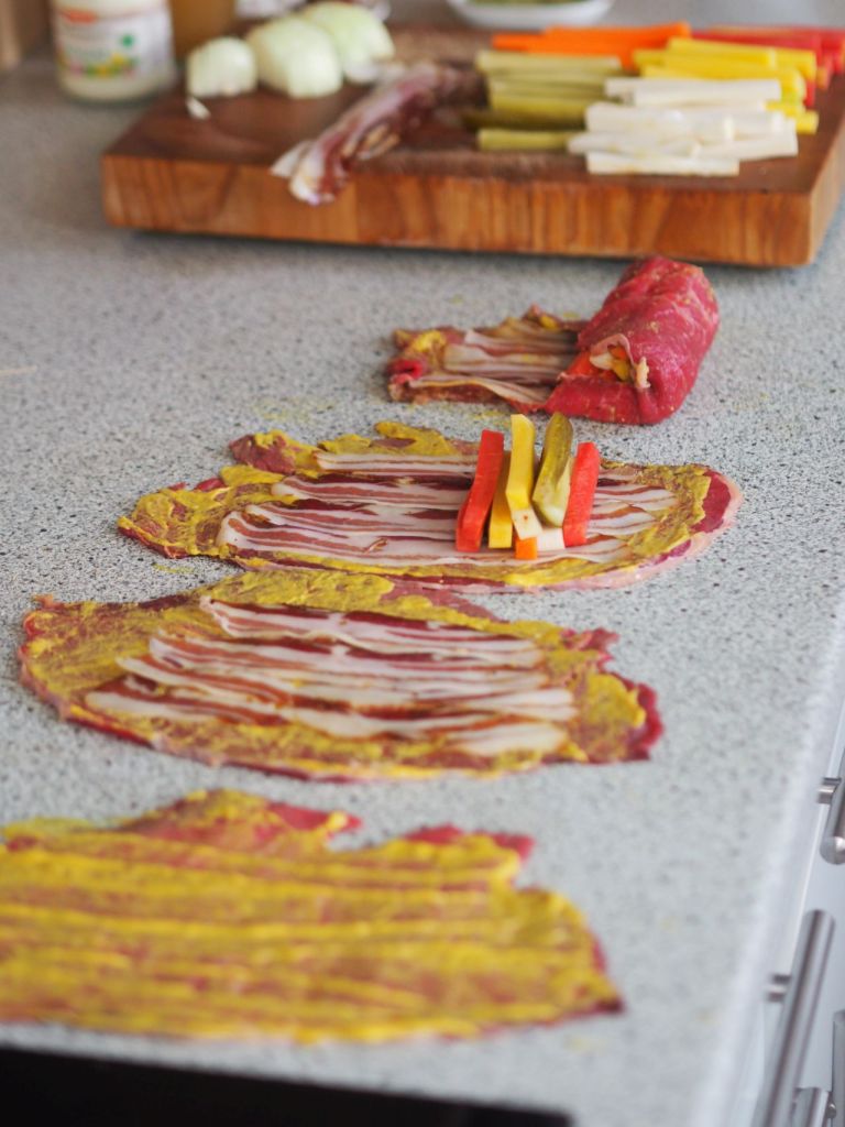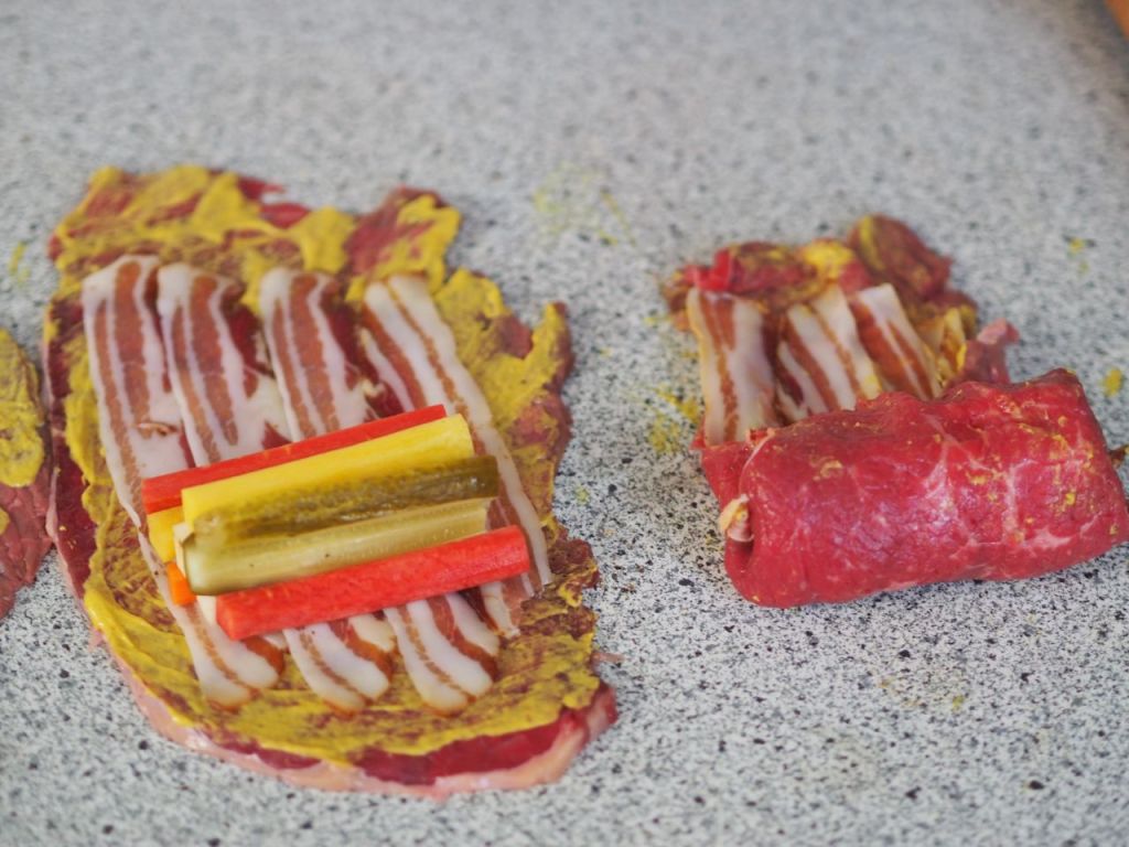 Rindsroulade einmal vor dem Einrollen und einmal eingerollt