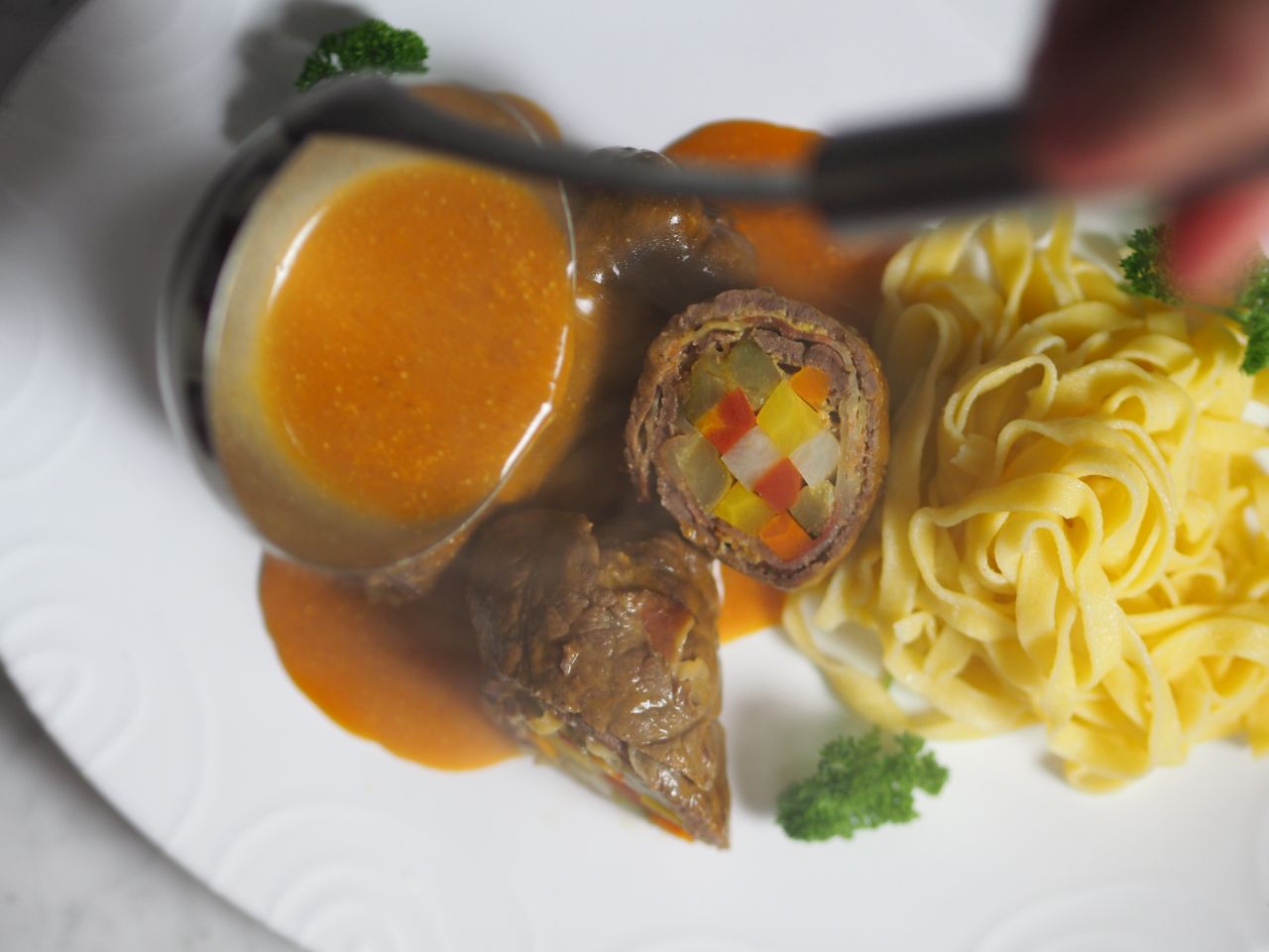 Rote, gelbe orange Karotten Petersilienwurzel Stück Sellerie Essiggurken in Stifte schneiden. Gleichmäßig geschnittene Oberösterreichische Rindsrouladen à 120 Gramm salzen pfeffern mit Senf bestreichen mit vier Scheiben Mühlviertler Speck belegen, Gemüse- und Essiggurkerl-Stiferln nach Lust und Laune auf den Speck legen. Die Rindsrouladen kompakt zusammenrollen. Mit Küchengarn verschnüren. In einer Bratpfanne Butterschmalz erhitzen. Rouladen von allen Seiten anbraten aus dem Bräter nehmen auf die Seite stellen. Eine große grob gehackte Zwiebel in den Bräter geben und das vom Stifteln übrig gebliebene Gemüse dazu geben anbraten. Zwei Teelöffel Tomatenmark einrühren kurz mitbraten und mit Rinderbrühe aufgießen. Drei Lorbeerblätter sechs zerdrückte Wacholderbeeren und 10 Stück Pfefferkörner plus vier zerdrückte Knoblauchzehen in die Sauce geben. Die Rindsrouladen wieder zurückgeben und zugedeckt im Backrohr bei 160 Grad zirka 1 Stunde 20 garen. Aus dem Backrohr nehmen. Die Rouladen herausnehmen den Küchengarn entfernen. Abdecken, damit es schön warm bleibt. Die Sauce abseihen. Mit zwei Teelöffel Crème fraîche und Maisstärke binden. Die Rouladen wieder in die Sauce geben und durchziehen lassen. Nudeln 130 Gramm Weizengrieß mit einem Dotter und soviel Weißwein verkneten, damit ein geschmeidiger Teig entsteht. Eine Stunde ruhen lassen. Durch die Nudelmaschine drücken. Salzwasser aufkochen Nudeln ein bis zwei Minuten bissfest kochen. Anrichten.