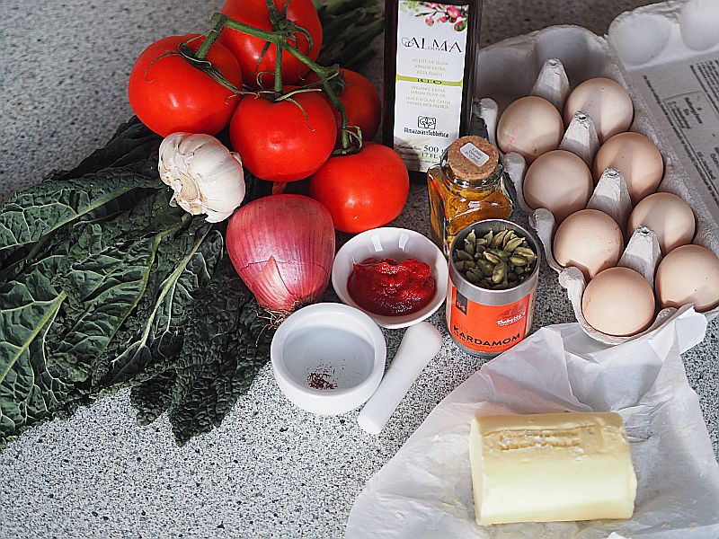 In einer kleinen Schüssel mit zwei Eßlöffel lauwarmem Wasser sechs Safranfäden einweichen. Den feingehackten Zwiebel in einem Sautoir anschwitzen. Einen Eßlöffel Tomatenmark dazu geben, kurz dünsten. Den Safran samt Einweichwasser dazu geben. Geriebenen Ingwer, sieben geschnittene Knoblauchzehen und etwas Kurkuma sowie drei ganze Kardamomkapseln dazu geben, ein paar Minuten mitdünsten. Acht Tomaten blanchieren, die Haut abziehen und in Würfeln schneiden, in den Sautoir geben. Zehn Schwarzkohlblätter entstielen, in Salzwasser kurz einlegen, abgießen und abschrecken. Ausdrücken, dann klein hacken und in den Sautoir geben. Drei vier Minuten mitdünsten, vom Herd nehmen. Mit einem Schöpfer in die Masse sechs kleine Mulden hineindrücken und jeweils ein Ei gießen. Im Backrohr bei 140 Grad 20 Minuten garen lassen.