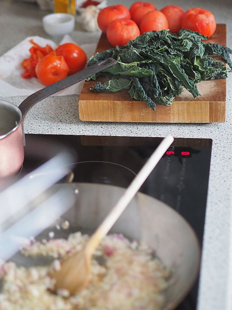Eine Variante von Shakshuka mit Spinat findet sich in Alexander Herrmanns Kochbuch „Weil’s einfach gesünder ist“. Den Spinat haben wir saisongerecht durch Schwarzkohl ersetzt.