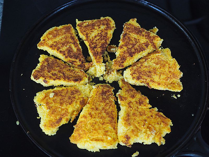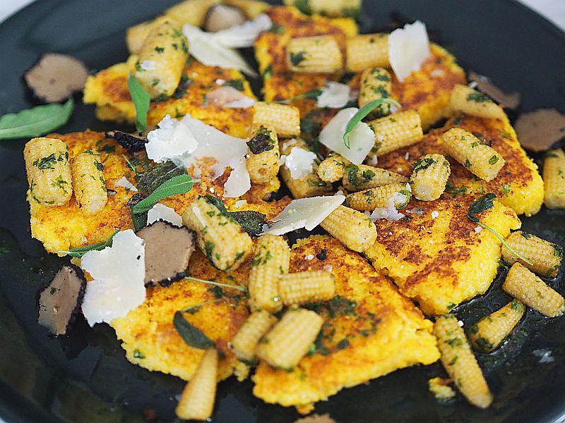 150 Milliliter Milch und 150 Milliliter Wasser, zwei Lorbeerblätter, Salz und eine Prise Muskatnuß aufkochen, zurückdrehen und 100 Gramm Polenta einrieseln lassen. Auf ganz kleiner Flamme unter ständigem Rühren etwa drei Minuten köcheln lassen. Vom Herd nehmen, Lorbeerblätter entfernen, einen Dotter rasch einrühren und dann in eine runde Tortenform auf Backpapier gießen. Vollständig auskühlen lassen, in der Zwischenzeit 40 Gramm Butter aufschäumen, 120 Gramm in grobe Stücke geschnittene Maiskölbchen kurz mitbraten. Einen Teelöffel Trüffelbutter und einen Eßlöffel fein gehackte Petersilie einrühren und auf die Seite stellen. Die ausgekühlte Polenta aus der Form nehmen. In acht Teile schneiden und in Butterschmalz in einer Palatschinkenpfanne beidseitig goldbraun anbraten. Fertigstellen/ Anrichten Auf den Teller platzieren. Die Butter mit den Maiskölbchen noch mal erwärmen. Salbeiblätter dazu geben, die Mais-Butter-Salbei-Mischung auf der Polenta verteilen. Mit Parmesanspänen und in dünne Scheiben gehobelte Trüffel bestreuen.