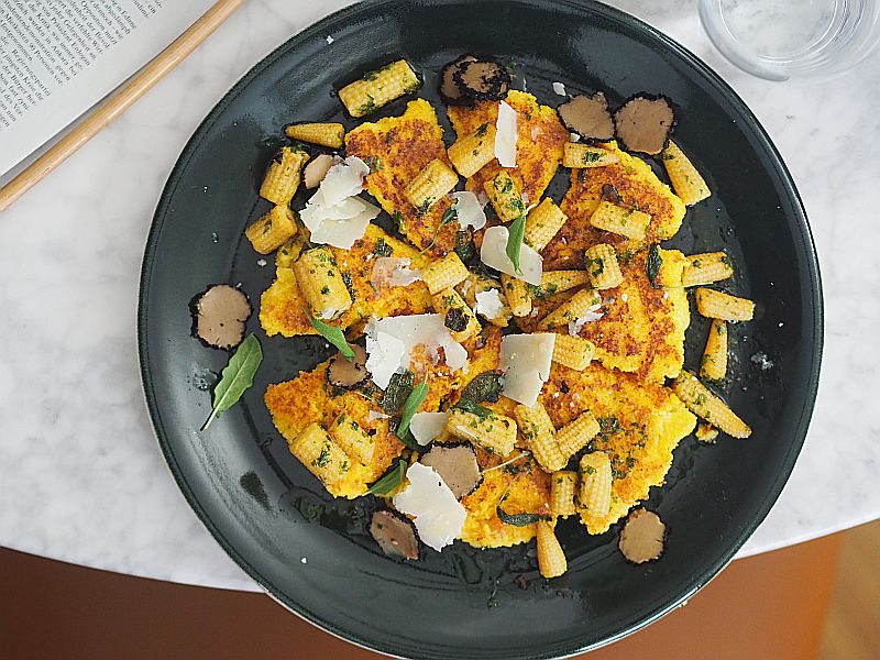 150 Milliliter Milch und 150 Milliliter Wasser, zwei Lorbeerblätter, Salz und eine Prise Muskatnuß aufkochen, zurückdrehen und 100 Gramm Polenta einrieseln lassen. Auf ganz kleiner Flamme unter ständigem Rühren etwa drei Minuten köcheln lassen. Vom Herd nehmen, Lorbeerblätter entfernen, einen Dotter rasch einrühren und dann in eine runde Tortenform auf Backpapier gießen. Vollständig auskühlen lassen, in der Zwischenzeit 40 Gramm Butter aufschäumen, 120 Gramm in grobe Stücke geschnittene Maiskölbchen kurz mitbraten. Einen Teelöffel Trüffelbutter und einen Eßlöffel fein gehackte Petersilie einrühren und auf die Seite stellen. Die ausgekühlte Polenta aus der Form nehmen. In acht Teile schneiden und in Butterschmalz in einer Palatschinkenpfanne beidseitig goldbraun anbraten. Fertigstellen/ Anrichten Auf den Teller platzieren. Die Butter mit den Maiskölbchen noch mal erwärmen. Salbeiblätter dazu geben, die Mais-Butter-Salbei-Mischung auf der Polenta verteilen. Mit Parmesanspänen und in dünne Scheiben gehobelte Trüffel bestreuen.