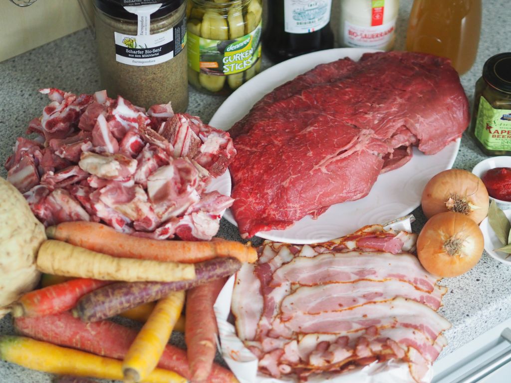 Zutatenbild: Schwarzes Scherzel aufgeschnitten 10 x für die Rindsrouladen, Speck, Wurzelgemüse, Kalbsknochen für Sauce, scharfer Senf im handlichen 1 kg Glas