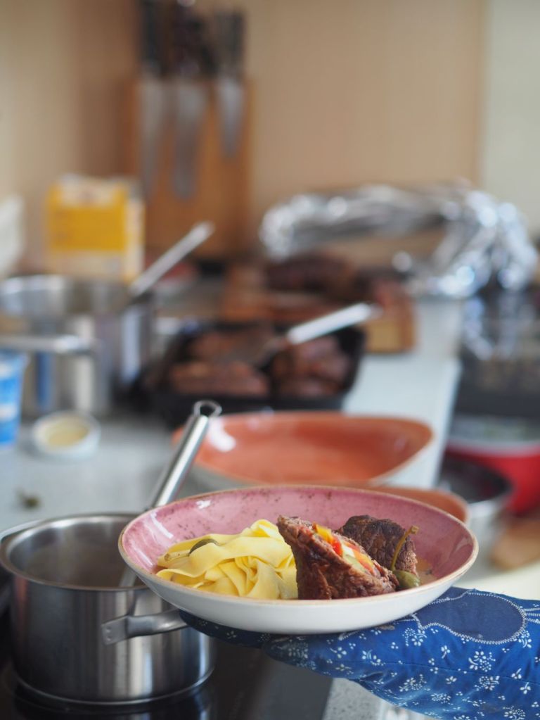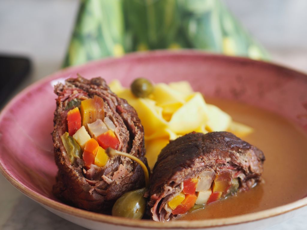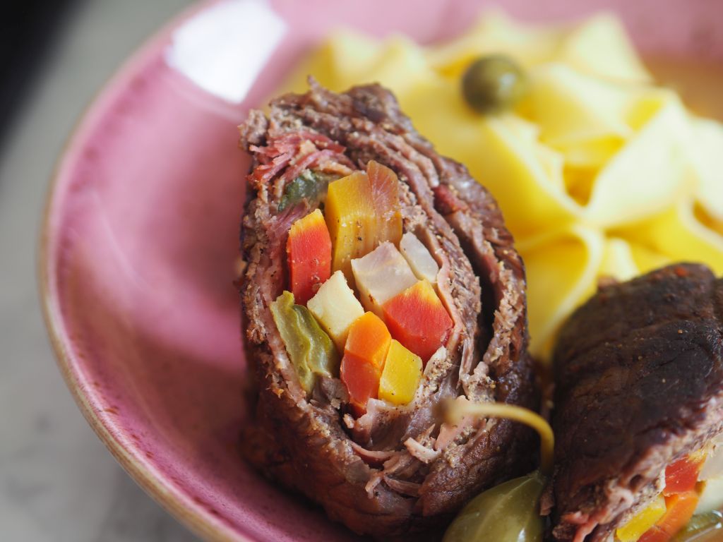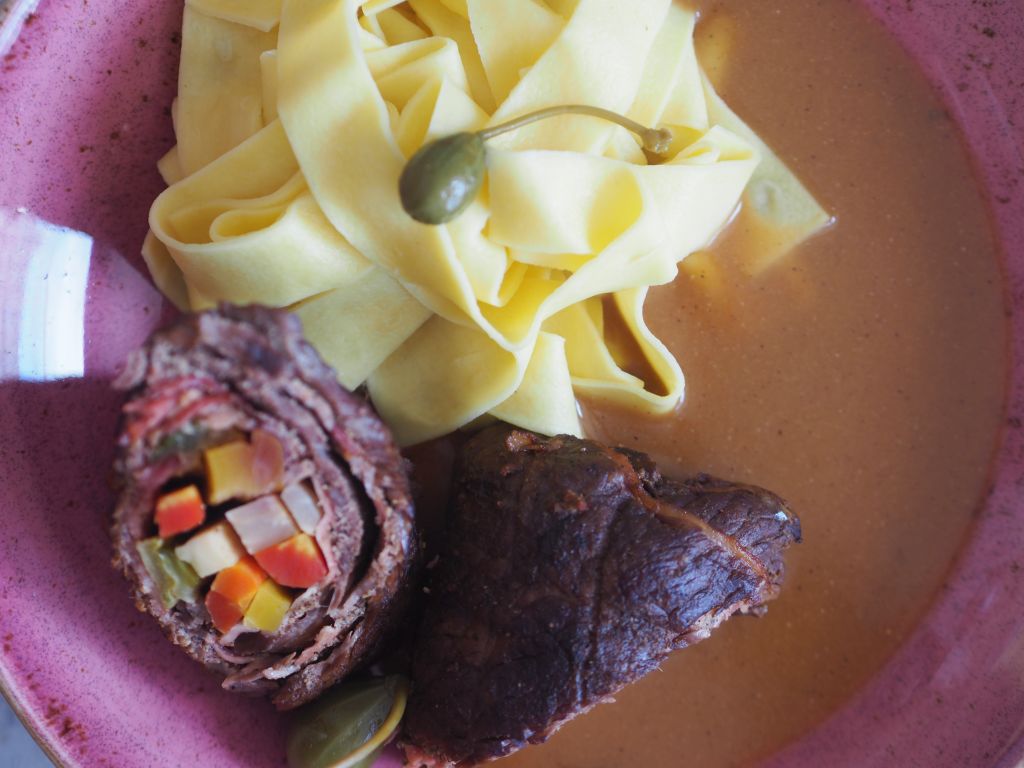 Rindsroulade mit Gemüse und Gurkerl, dazu Tagliatelle und die Kalbsknochen-Sauce
