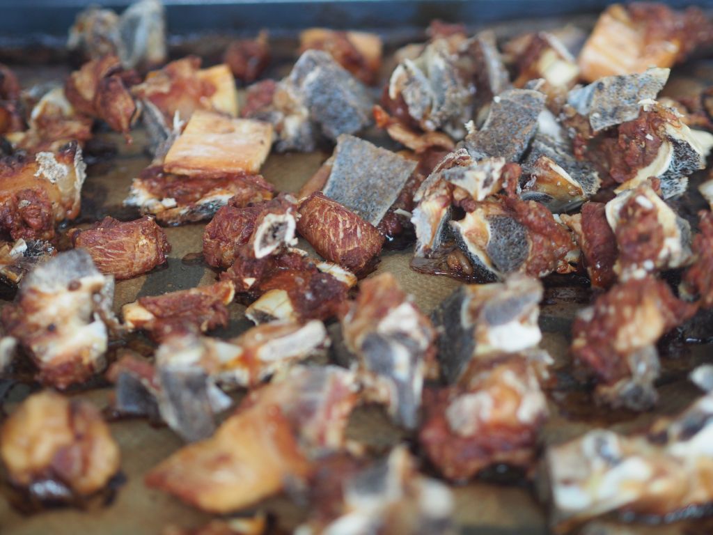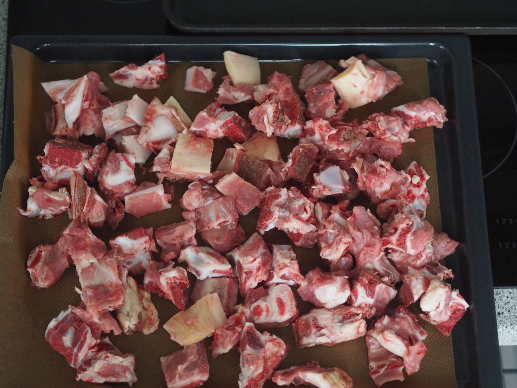 Knochen, nun angeröstet und bereit für 7 Stunden köcheln mit Gemüse und Rotwein