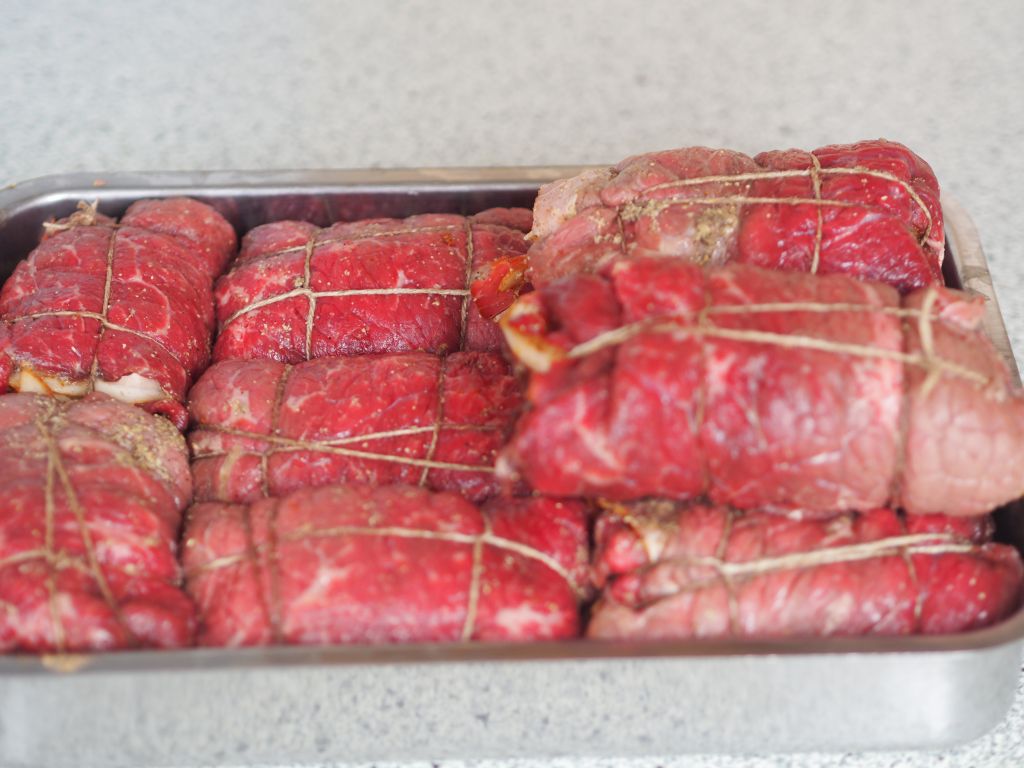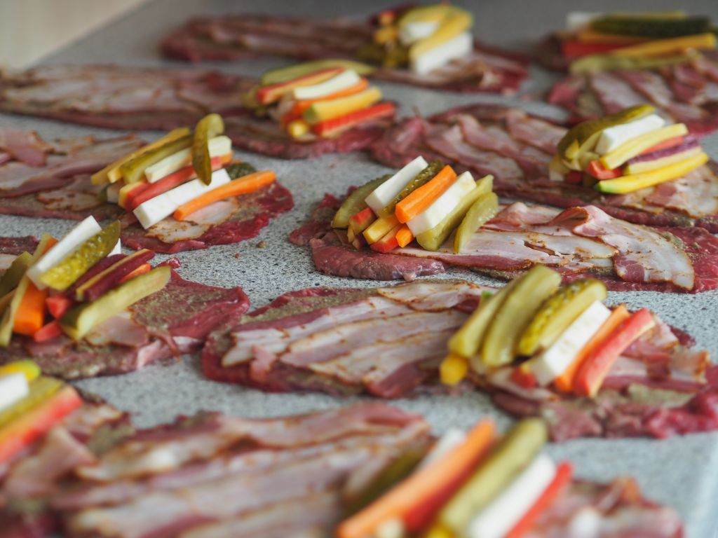 Gemüsestifte auf den Rouladen vor dem Zusammenrollen