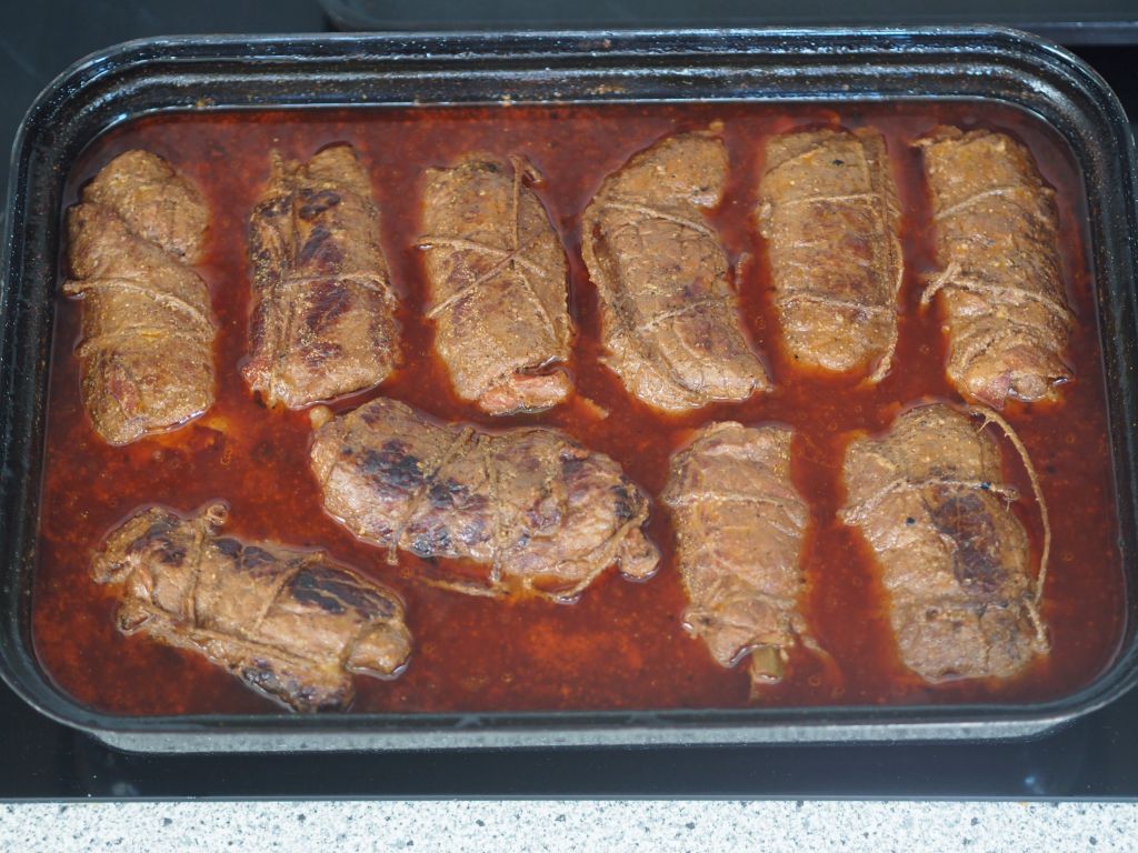 Die angebratenen Rindsrouladen mit Ochsenschwanzsuppe aufgegossen und mit Kalbsjus.