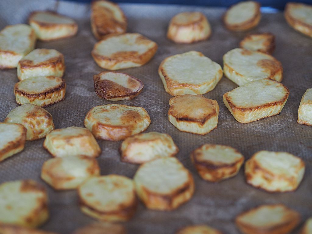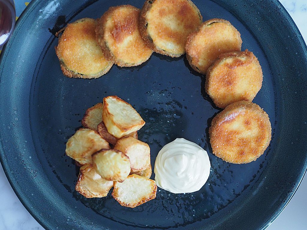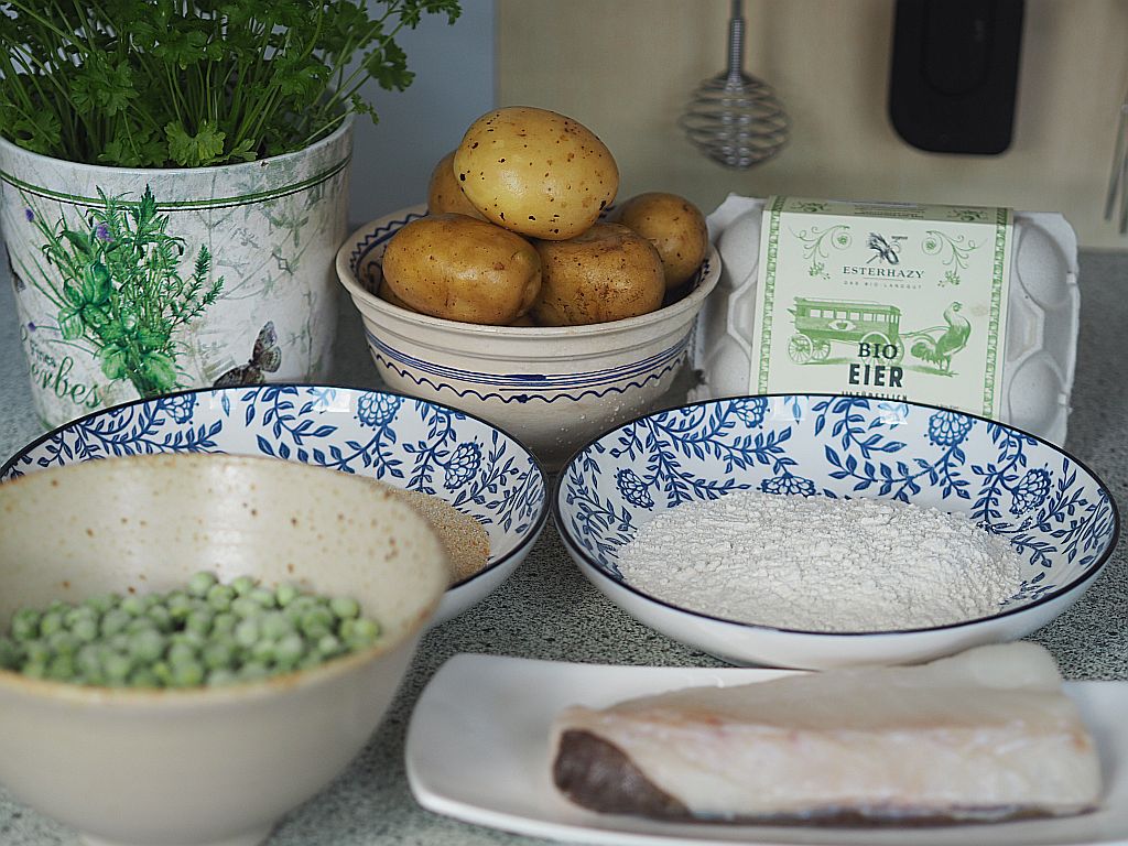 Erdäpfel schälen, in halbe cm dicke Scheiben schneiden, mit Olivenöl u Salz vermischen, im Ofen bei 200° goldbraun braten. TK-Erbsen fein gehackte Schalotten in brauner Butter anschwitzen, die TK-Erbsen dazugeben und so lange rühren, bis es auftaut. Salzen. Fisch (Kabeljau Loins) Haut abziehen, in 2 cm dicke Stücke schneiden, panieren, also mit Mehl, verrührtem Ei und Brösel und in heißem Öl herausbacken. Zucchini-Variante mit Zucchini-Scheiben statt Fisch. Anrichten mit Wildkräutersalat und Wasabi-Mayonnaise.