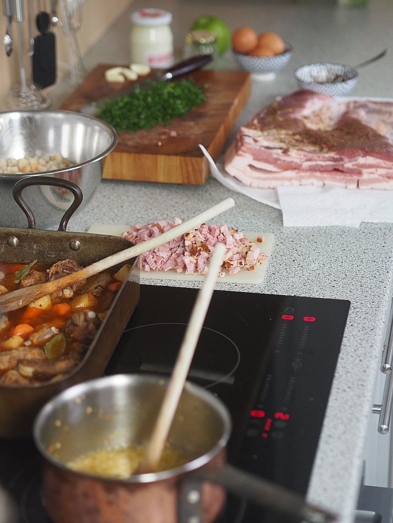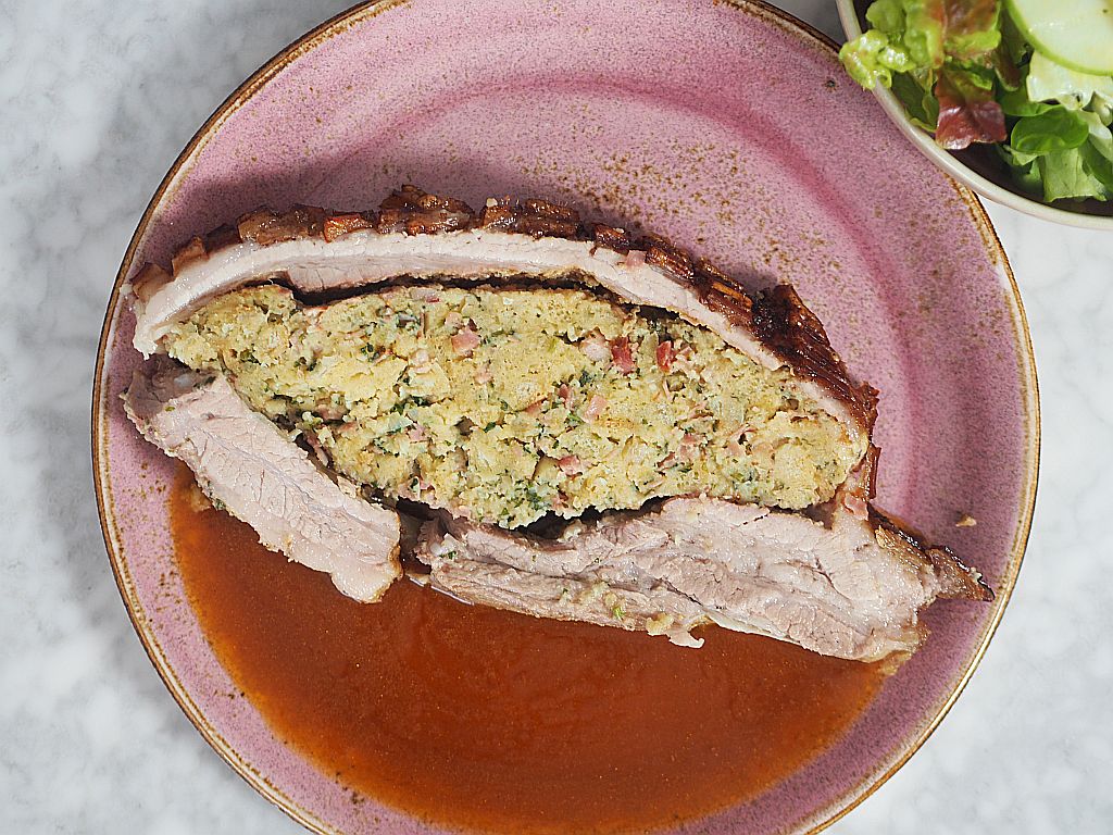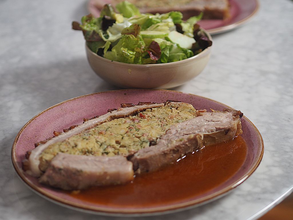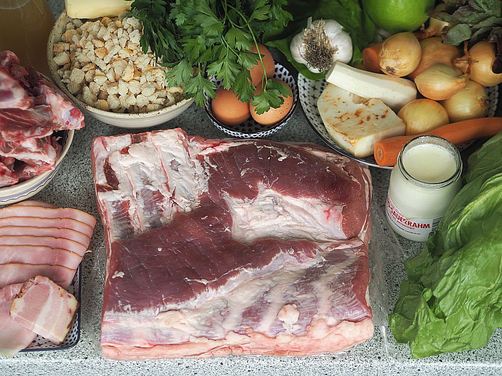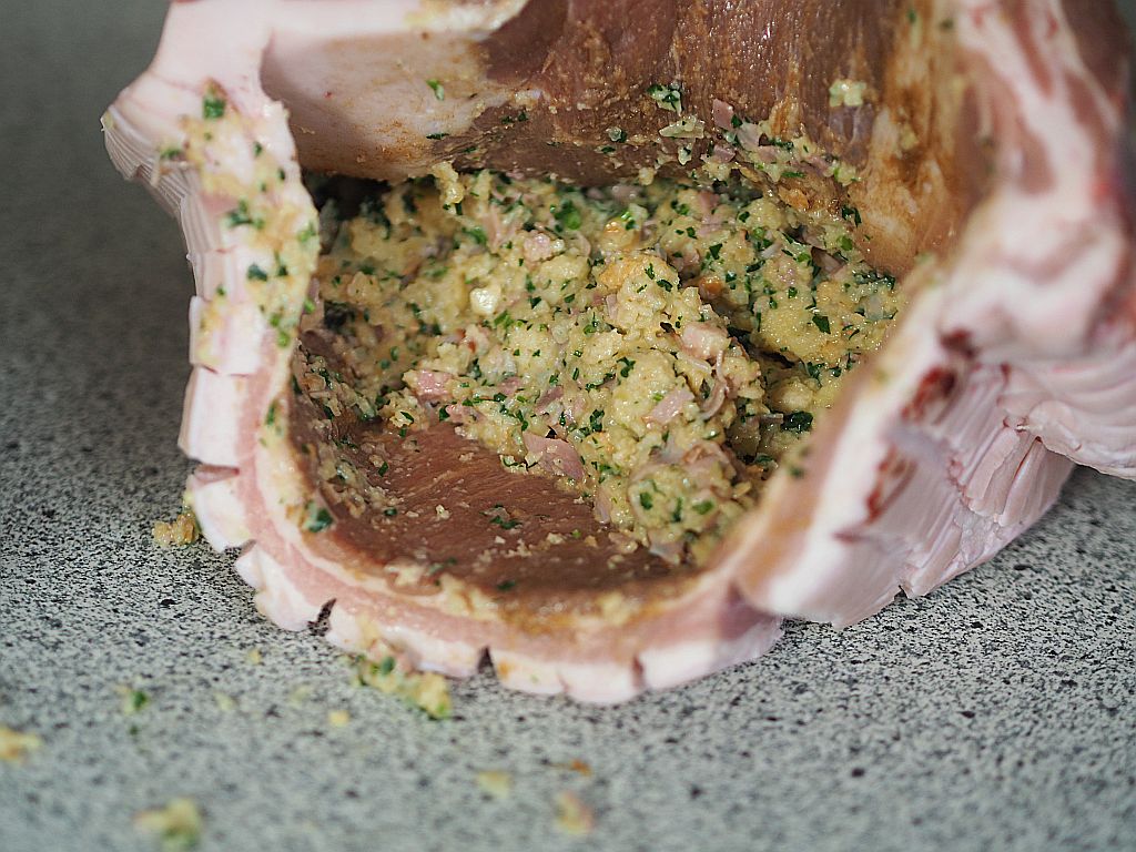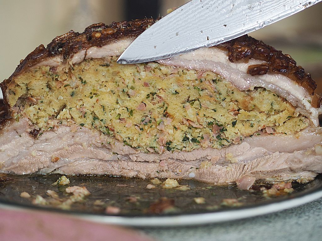 2,9 kg Schweinebauch, geschröpft, in den eine Tasche vom Fleischhacker eingeschnitten wurde (für uns hat das alles Fr. Ringl gemacht). Mit der Schwarte nach unten in ein Blech mit lauwarmem Wasser legen, ohne daß das Fleisch im Wasser steht nur das Fett. Eine Stunde stehen lassen. Für die Sauce: klein gehackte Schweinsknochen (vom Fleischhauer) in der Reine scharf anrösten. Drei kleine, grob gehackte Zwiebel, ein Viertel grob gehackten Sellerie, eine rote und eine gelbe geschnittene Karotte und eine gehackte Petersilienwurzel dazugeben, mitrösten. Zum Schluß mit hausgemachter Rinderbrühe aufgießen. Ein paar Pfefferkörner und ein Lorbeerblatt dazugeben. Für die Semmelfülle: Drei mittelgroße Zwiebeln fein hacken, in 10 dkg Butter etwas anschwitzen. 20 dkg Schinken in kleine Würfel schneiden, sowie 5 dkg Gewürzspeck. Zu den geschnittenen Zwiebeln geben und mitschwitzen lassen, bis die Zwiebeln goldbraun sind. 1 dl Milch dazugießen, kurz aufgießen vom Herd ziehen, Salz und Muskatnuß und einen halben Bund fein gehackte Petersilie einrühren. Die Mischung zu 20 dkg Semmelwürfel (aus Dinkel) gießen, durchrühren, ein bißerl auskühlen lassen und dann 120 ml Sauerrahm und drei mittelgroße Eier dazugeben und gut durchkneten. Die Gewürzpaste vorbereiten: 10 Knoblauchzehen reiben, 2 EL gemahlenen Kümmel, 1 TL Salz und einen Schluck Olivenöl zu einer Paste verrühren. Liachtbratl Das Bratl aus dem Wasser nehmen, trockentupfen, das Fleisch, nicht die Schwarte, innen und außen mit der Gewürzpaste einreiben. Die Semmelfülle locker in die Tasche füllen. Denn die Fülle geht beim Braten auf. Die Öffnung mit einer Fleischnadel verschließen. Die Schwarte mit Zitronensaft einmassieren und eine Viertelstunde einziehen lassen. Das Bratl ins Reindl auf die Schweinsknochen stellen und ins Backrohr schieben. Auf 220 Grad drehen und 20 Minuten braten lassen, dann auf 180 Grad zurückdrehen. Dann 2 ½ Stunden lang braten lassen. Den Braten herausheben und warmstellen. Die Sauce durch ein Spitzsieb abgießen. Anrichten einen Eichblatt-, Häuptel- und Zuckerhutsalat mit grünem Apfel, Apfelessig und Leinöl anmachen.