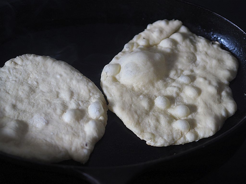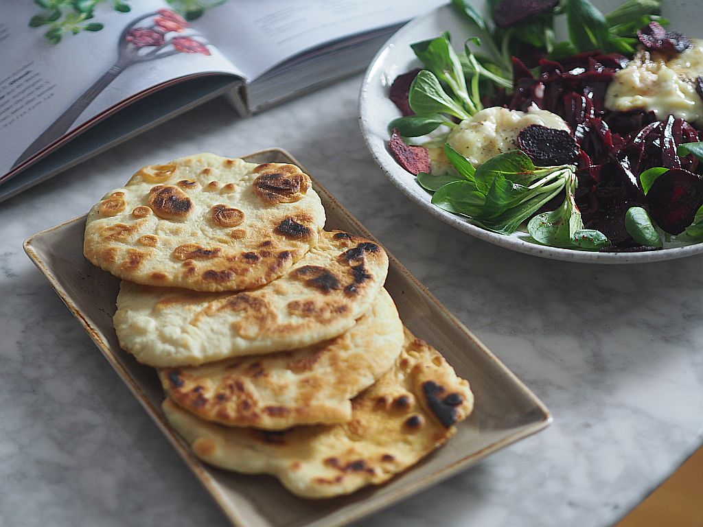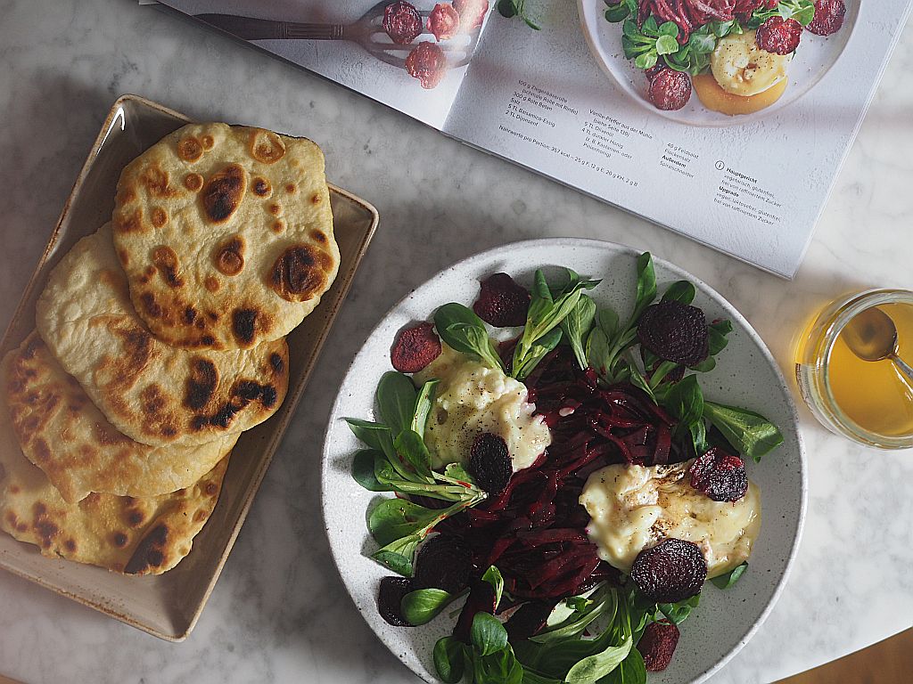 Jetzt werden einige von euch sagen: schon wieder ein Salat! Salat Salat die ganze Zeit Salat… aber dafür gibt’s bei uns auch keine Teigtascherlrazzia. Zu einer solchen ist es tatsächlich gekommen, 2019, als illegale Teigtascherlfabriken in Privatwohnungen ausgehoben wurden. Dazu fällt mir das Lied „Shanghai Noodle Factory“ ein, von der englischen Rockband „Traffic“, wer‘s kennt. Da geht’s um selbiges Thema, nur auf eine romantisierende Art. Obwohl es arbeitsreich und vermutlich ausbeuterisch war, sehnt sich der Sänger zurück in die Nudelfabrik in Shanghai… Das kann man sich gar nicht mehr vorstellen, daß jemand sowas schreibt, nicht wahr? Da geht’s ja um Arbeiten… und daß das irgendjemand befriedigend findet… aber so war das damals. Ich schweife ab: der heutige Salat ist wieder mal aus dem Salatbuch „Salate der Superlative“. Rote-Bete-Spaghetti mit überbackenem Honig-Ziegenkäse, S. 18. Der wunderbare Honig stammt von einem mir persönlich bekannten Imker. Mit selbst gemachtem Dinkelpfannen-Brot, auch aus dem Buch.