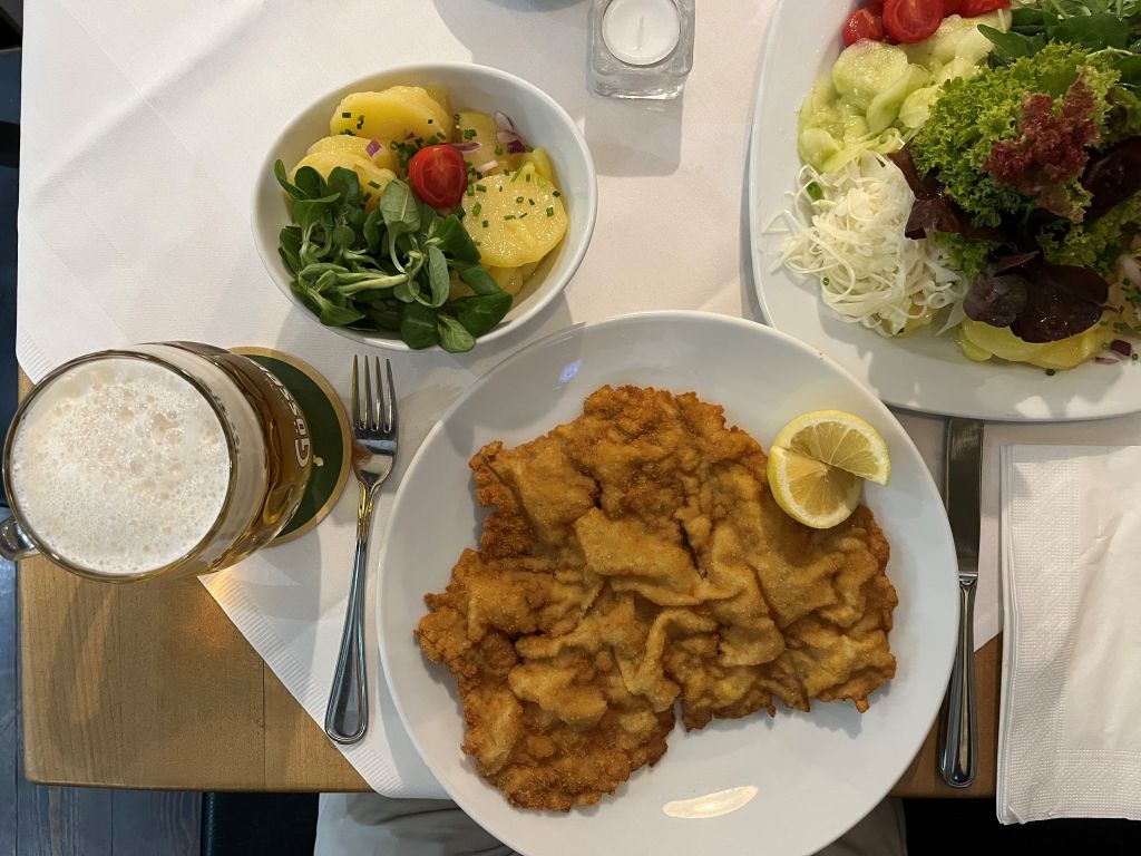 Wer hat das größte Schnitzel im ganzen Land? Das Wiener Schnitzel in der Gösser-Bierklinik ist recht groß, aber vor allem ist es eines: es ist so zart und so fein wie kaum ein anderes und doch von fester Beschaffenheit, eben vom Kalb, einmalig, da braucht man nicht mehr, vielleicht ein bisserl einen Erdäpfelsalat, ein Gedicht.