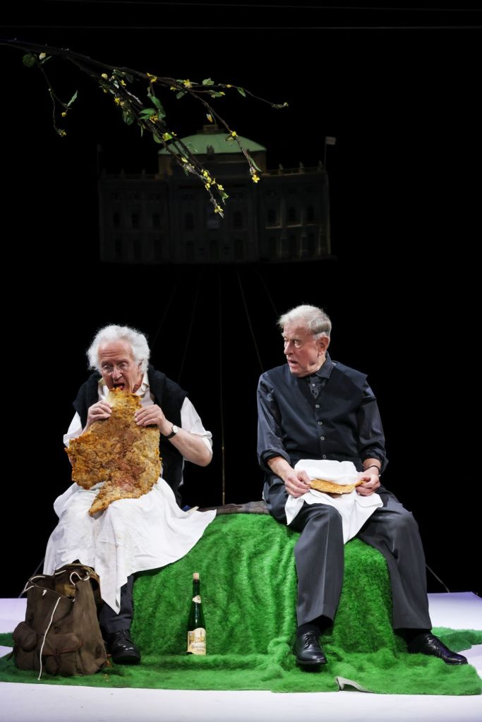 Das größte Schnitzel gibt es auf der Bühne in Thomas Bernhards „Claus Peymann und Hermann Beil auf der Sulzwiese“, mit Claus Peymann als Claus Peymann und Hermann Beil als Hermann Beil. Claus Peymann hat schon ein großes, doch das Schnitzel von Hermann Beil übertrifft bei weitem jegliche Vorstellungskraft. Das ist ein Schnitzel. Gesehen im Theater in der Josefstadt am 23. 6. 2023. „Oh, wie schön“ rief Hermann Beil aus und Claus Peymann entkam ein „Ach ja“ als sie beim Signieren meiner Erstausgabe des im Suhrkamp-Verlag erschienenen Buchs „Claus Peymann kauft sich eine Hose und geht mit mir essen“ von Thomas Bernhard ansichtig wurden.