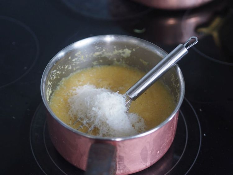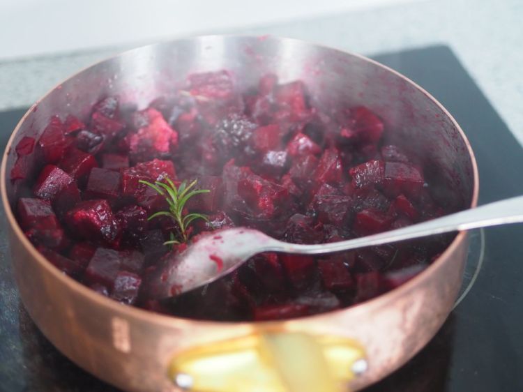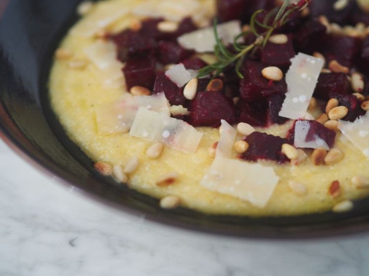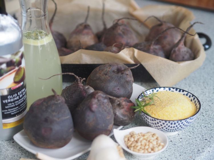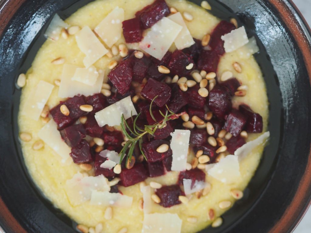 Rote Rüben im Ofen durchgaren, schälen, würfeln und in einer Pfanne mit gehacktem Knoblauch, Salz und Rosmarin in Olivenöl anbraten. Instant-Polenta in Gemüsebrühe fertigkochen, zum Schluß geriebenen Parmesan hineinrühren. Pinienkerne ohne Öl in einer Pfanne anrösten.
