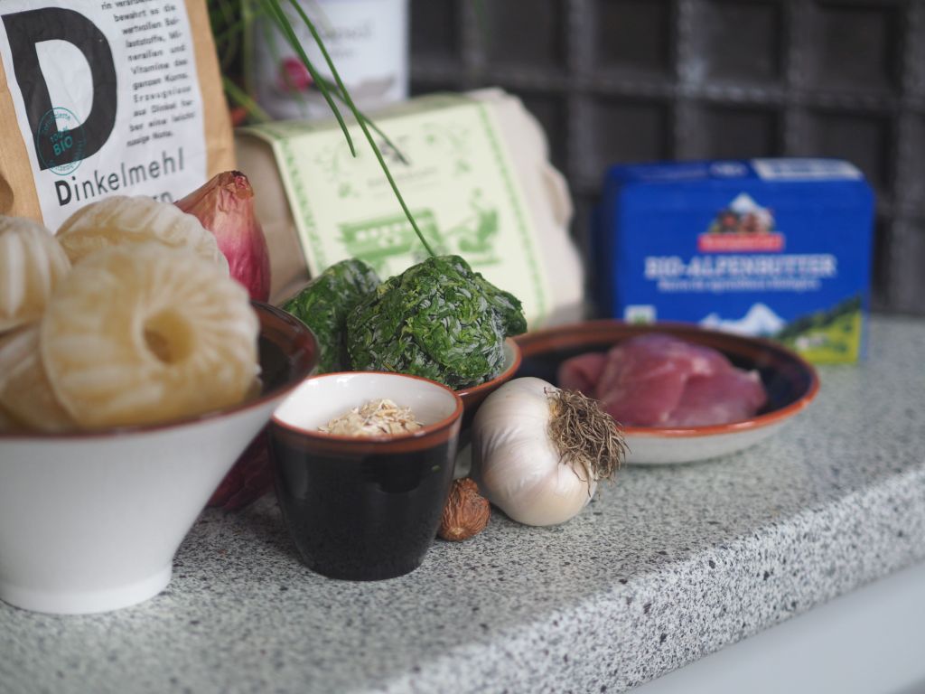 Die gefrorenen Hühnersuppen-Gugelhupfe aufkochen. 125 g Dinkelmehl, 1 ½ Ei, Prise Salz zu einem geschmeidigen Teig kneten. In Folie gewickelt im Kühlschrank kalt stellen. I n d e r Z w i s c h e n z e i t : 2 kleinere feingehackte Zwiebel in einer Mischung aus 25 g Rapsöl und 25 g Butter anschwitzen. 4 geriebene Knoblauchzehen dazugeben. 100 g aufgetauten TK-Spinat hacken und zur Pfanne zu den Zwiebeln dazu geben. Zwei drei Minuten mitschwitzen. 50 g Putenfilet klein hacken und zum Spinat geben. Mitschwitzen, umrühren, auskühlen lassen. 50 g Haferflocken und ½ Ei hineingeben, miteinander gut verrühren. Zwiebel in Scheiben schneiden, in einzelne Ringe teilen, in Dinkelmehl wälzen, in heißem Öl frittieren und auf Backpapier abtropfen lassen.