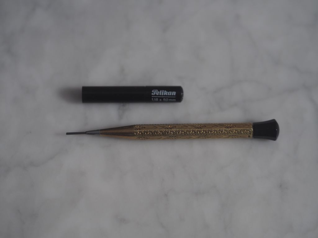 Für den Minenbleistift, von dem wir annehmen, daß es sich beim Muster um Jugendstil handelt, haben wir nun das richtige Papierfachgeschäft gefunden, das nämlich die passenden Bleistiftminen führt, selbst eine so seltene wie die benötigten mit 1,18 mm Durchmesser. Die Inhaberin hat das Geschäft neu übernommen, mit 80 Jahren (!), an der Tür hängt noch das Neuübernahme-Schild. Wir hatten den Minenbleistift zu Hause vergessen, doch dank der Leidenschaft der neuen Inhaberin gelang es, die richtige Mine zu finden! Durch das allgemeine Sterben der Papierwarengeschäfte, – kaum noch jemand schreibt, alle wischen nur – das letzte in Meidling, das Papierello, hat erst unlängst für immer die Türen geschlossen – waren wir froh, dieses Geschäft zu finden. Nun haben wir wieder eine Anlaufstelle für Schreibutensilien wie Stifte, Minen, Papier und alles was dazu gehört.