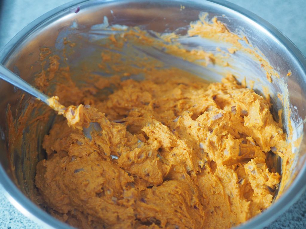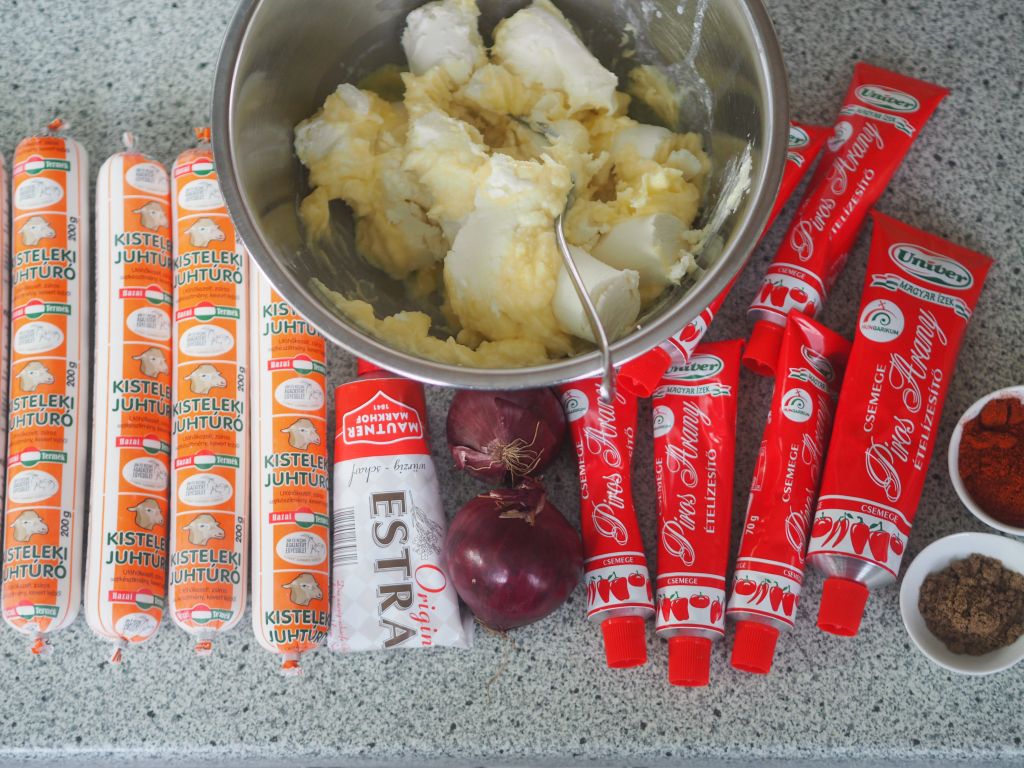 Man kann es nicht genau sagen, so die Küchenfee, – strengstes Küchengeheimnis – aber es geht ungefähr so: Man verrühre Brimsen, weiche Butter, Estragonsenf, Piros Arany, Kümmel, Paprikapulver süß und gehackte rote Zwiebel. Man achte darauf, daß beim Probieren und Abschmecken noch etwas übrigbleibt.