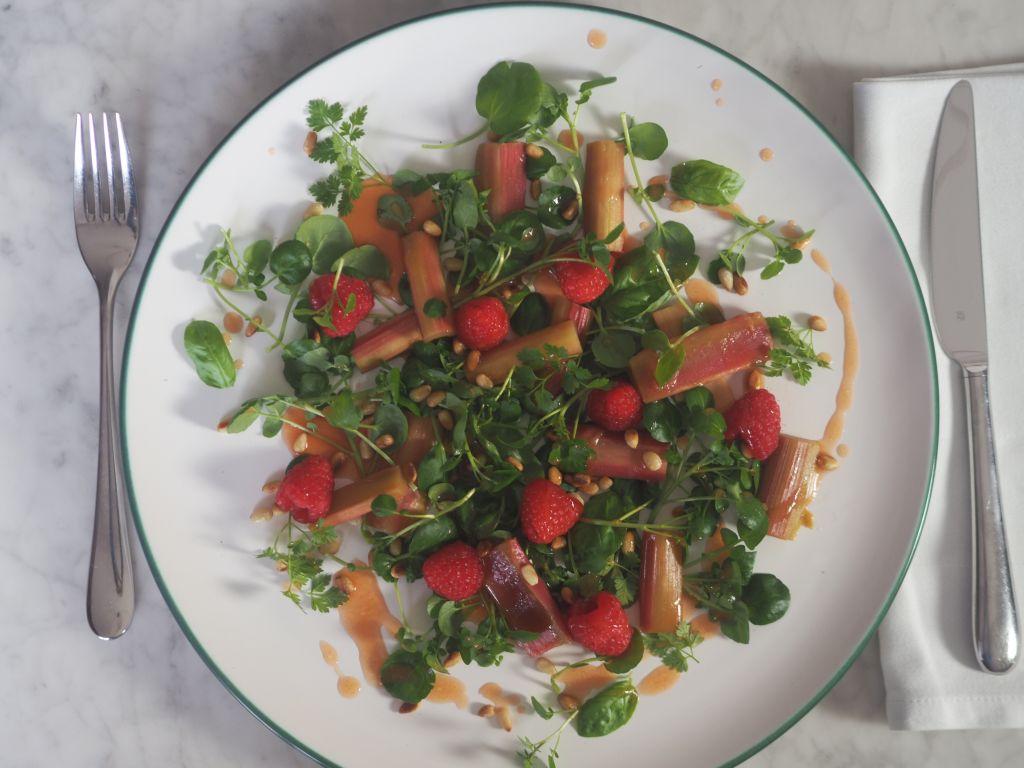 Wie gut hat das geschmeckt! Deshalb kommt hier das Rezept. diese Ausgewogenheit. Rhabarber ist leicht säuerlich und etwas herb. die Brunnenkresse schmeckt deutlich bitter und etwas pfefferig, die Himbeeren sind süß und säuerlich und die Pinienkerne sind nußig süß, herrlich, einfach herrlich! Ein Höhepunkt der kulinarischen Moderne! Unnachahmlich!