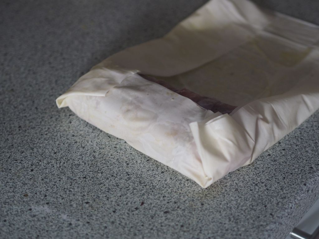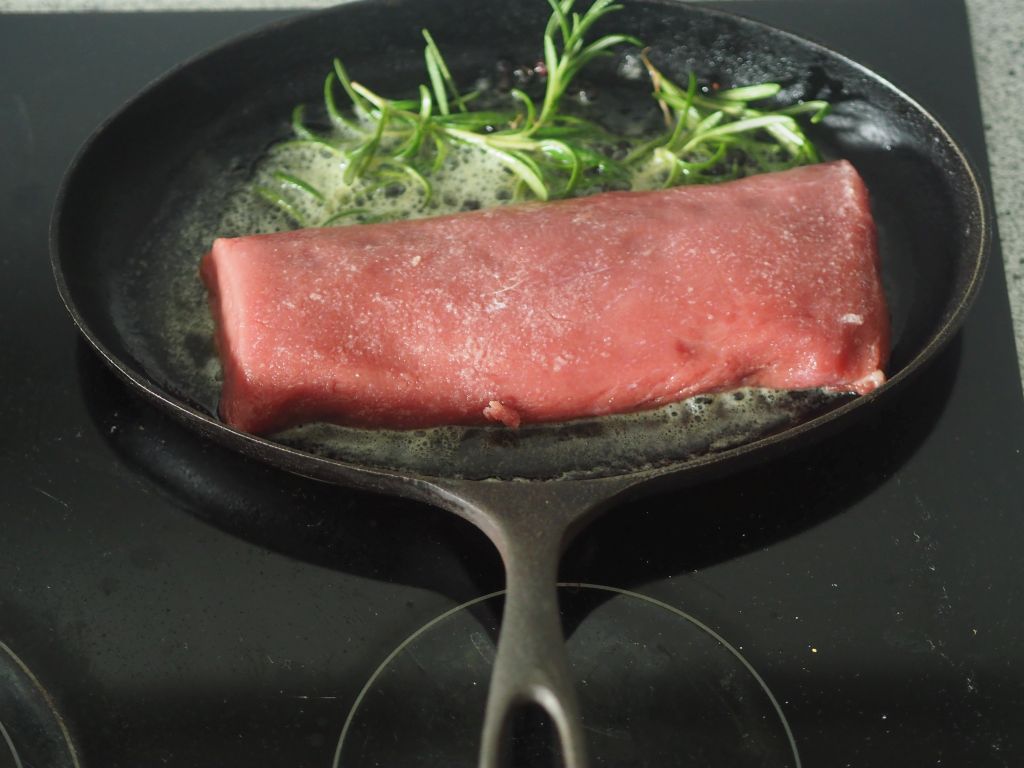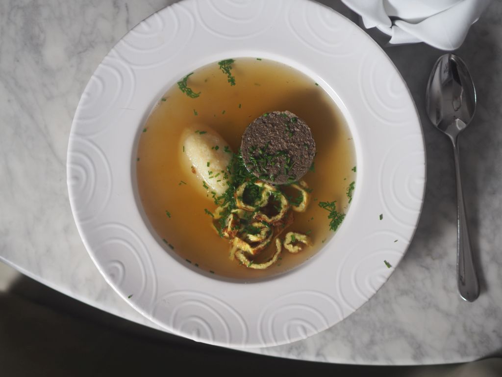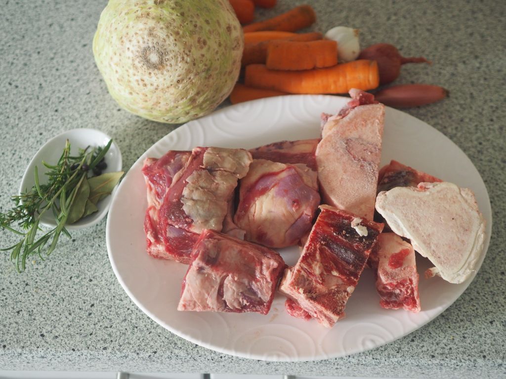 Als Vorspeise gab es Suppe, die Trilogiesuppe, das ist Grießnockerl, Leberknödel und Frittaten, nach einer Idee von der Basisstation, einem Wiener Gasthaus wo wir früher öfter waren, vor der Coronazeit. Das wurde allesamt gekauft, aber ohne Konservierungsstoffe, von einem Metzger. Die Suppe selbst wurde schon selber gemacht, mit Fleischknochen vom Pinzgauer Rind und Fleckvieh aus Salzburg, das gibt es nun auch bei gurkerl.at.