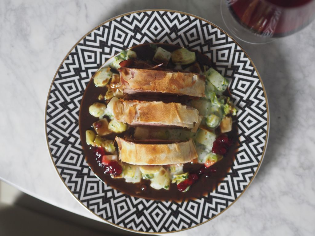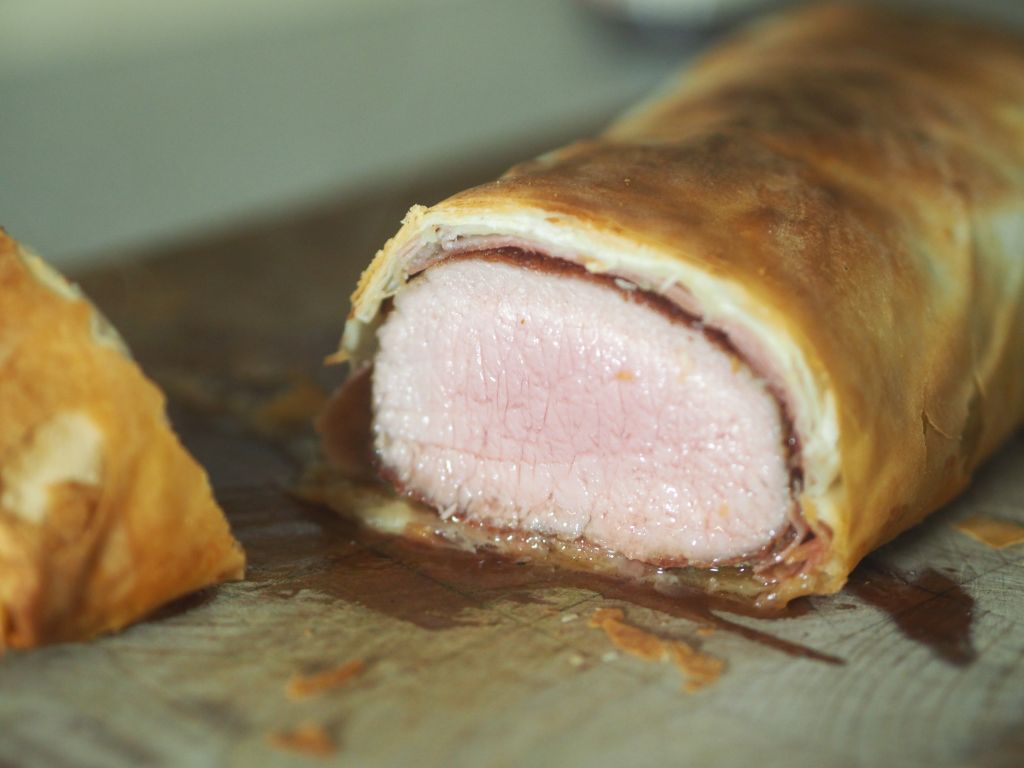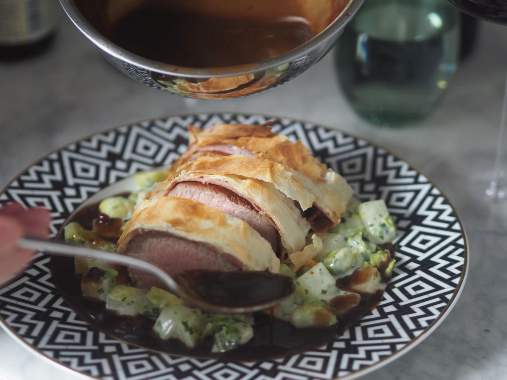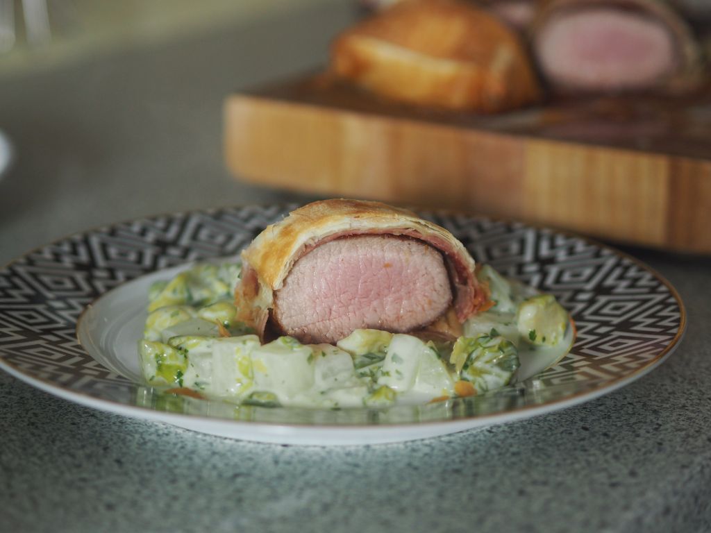 Hier passen die Preiselbeeren echt dazu. Sonst bin ich ja nicht so, beim Wiener Schnitzel lasse ich die meist weg. Aber hier? Zur Preiselbeer-Wild-Soße verrührt, mit dem kremigen Kohlrabi-Kohlsprossen-Gemüse… einfach köstlich, unvermeidbar köstlich! Das Wildschwein Wellington wurde gemacht nach einem Rezept vom Küchenmeister Johann Lafer aus dem Buch „Lafer Witzigmann Eine Freundschaft 100 Rezepte“, auf S. 213 steht es geschrieben, die Küchenfee hat sich nicht ganz daran gehalten und Wildschwein statt Rehrücken genommen, ansonsten wie im Buch, zum Ablöschen Cognac, statt Madeira gab es aber Portwein, die Mengen nach Gefühl. Das Wellingtonartige ist der Strudel, in dem der Wildschweinrücken von Esterhazy eingewickelt war. Am nächsten Tag wurde die Küchenfee in den Rang einer Hofköchin erhoben. Man darf jetzt nicht mehr sagen Küchenfee – sondern Frau Hofköchin, von und zu oder so; – Euer Gnaden geht auch, hat sie mir versichert.