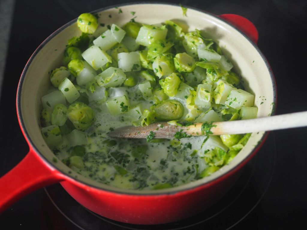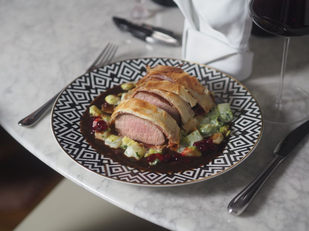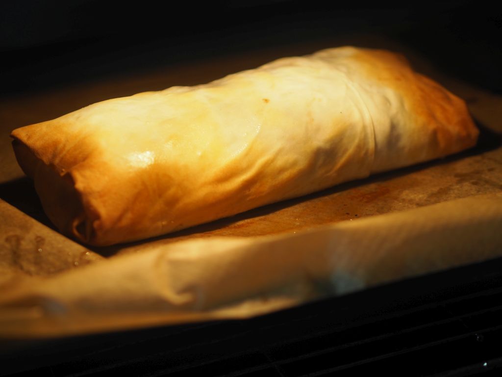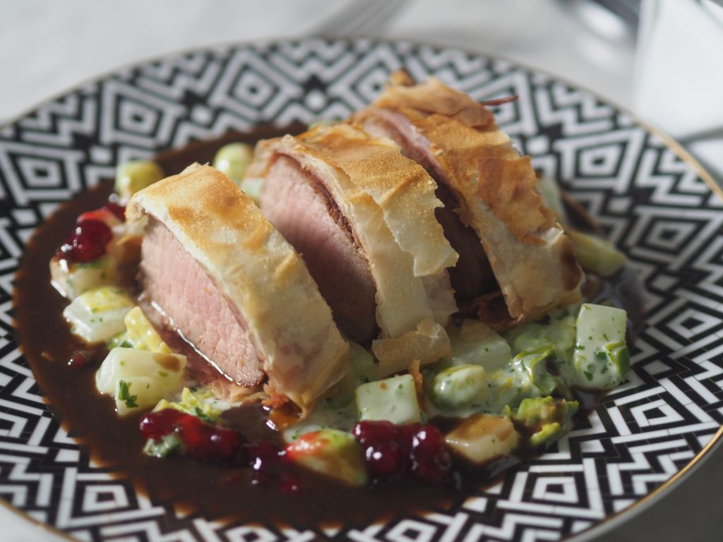 Hier passen die Preiselbeeren echt dazu. Sonst bin ich ja nicht so, beim Wiener Schnitzel lasse ich die meist weg. Aber hier? Zur Preiselbeer-Wild-Soße verrührt, mit dem kremigen Kohlrabi-Kohlsprossen-Gemüse… einfach köstlich, unvermeidbar köstlich! Das Wildschwein Wellington wurde gemacht nach einem Rezept vom Küchenmeister Johann Lafer aus dem Buch „Lafer Witzigmann Eine Freundschaft 100 Rezepte“, auf S. 213 steht es geschrieben, die Küchenfee hat sich nicht ganz daran gehalten und Wildschwein statt Rehrücken genommen, ansonsten wie im Buch, zum Ablöschen Cognac, statt Madeira gab es aber Portwein, die Mengen nach Gefühl. Das Wellingtonartige ist der Strudel, in dem der Wildschweinrücken von Esterhazy eingewickelt war. Am nächsten Tag wurde die Küchenfee in den Rang einer Hofköchin erhoben. Man darf jetzt nicht mehr sagen Küchenfee – sondern Frau Hofköchin, von und zu oder so; – Euer Gnaden geht auch, hat sie mir versichert.