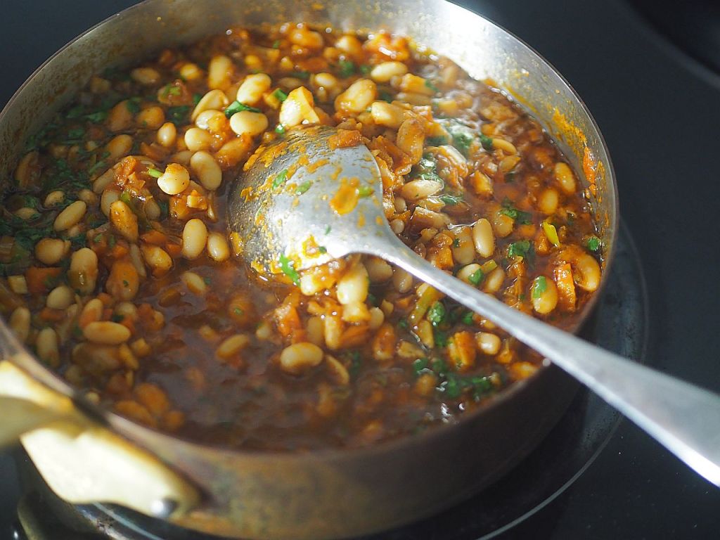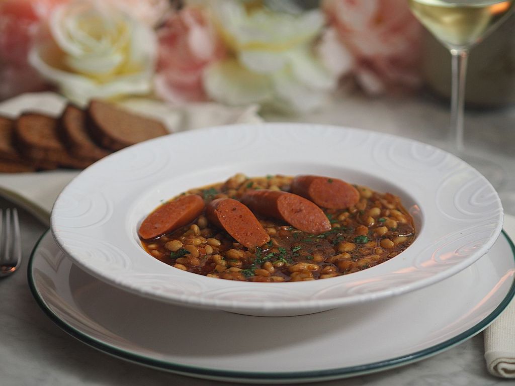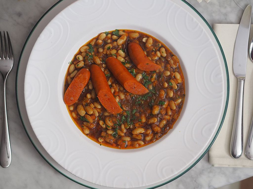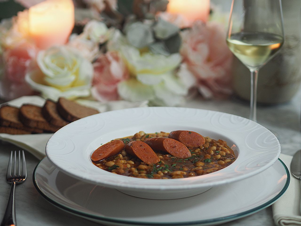 Debreziner Würstel mit Sofrito-Bohnen-Eintopf