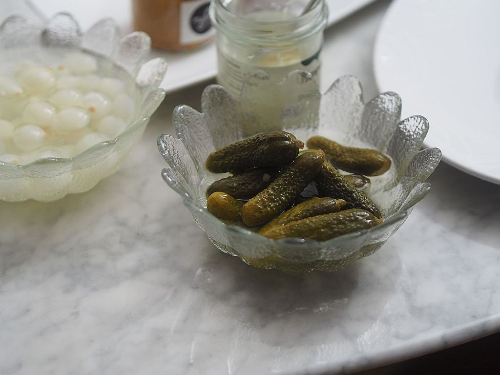 Rehfrankfurter, Wildpuszta, Wildkäsepuszta. Die Rehfrankfurter waren knackig, wie Wiener Würstel es sein müssen. Die Wildpusztawürstel mit/ohne Käse waren fleischig, scharf – – ein Genuß. Da braucht‘s keinen Senft, nur zu den Rehfrankfurter. Perlzwiebeln und Gurkerln aus dem Südburgenland (Südobst).