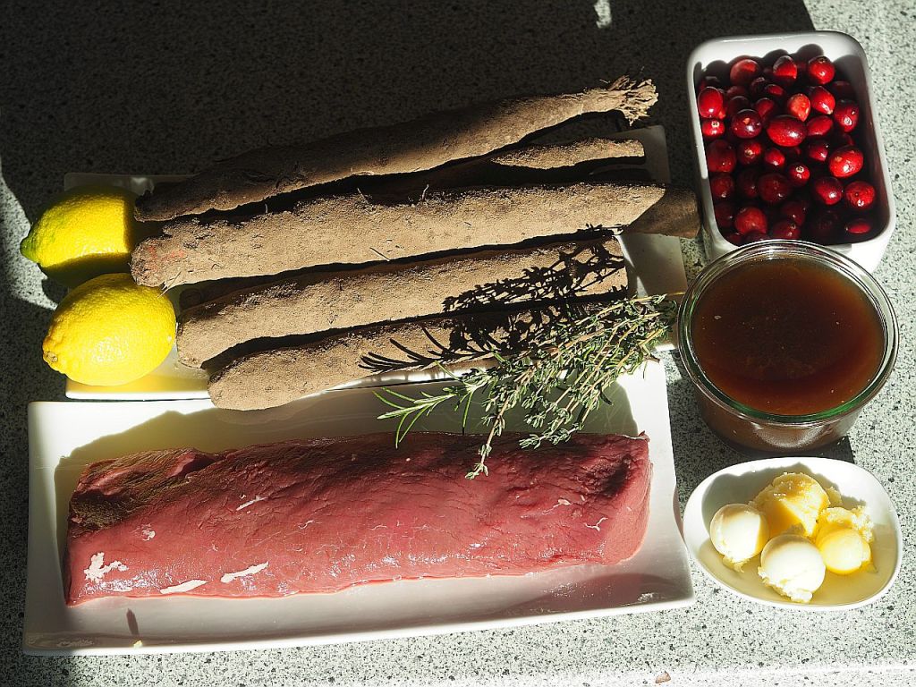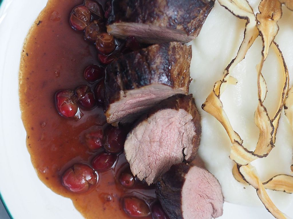 Die gestrigen Rehschnitzeln hat die Hofköchin mit Kartoffeln gemacht. Die Kartoffeln und das Wild, die der kulinarische Geist zu vereinigen sich nicht rühmt, passen sehr gut zusammen. Getrennt von den Kartoffeln geht das gebratene Hirschfilet mit der erdigen Schwarzwurzel eine Wunderverbindung ein. Der Hirschrücken ist so fein, als wär es ein Filet; das Schwarzwurzelpüree ist so fein, fein wie Kartoffelpüree, nur nicht so patzig, dafür geschmeidig elegant. Der Cranberry-Wild-Jus rundet alles ab.