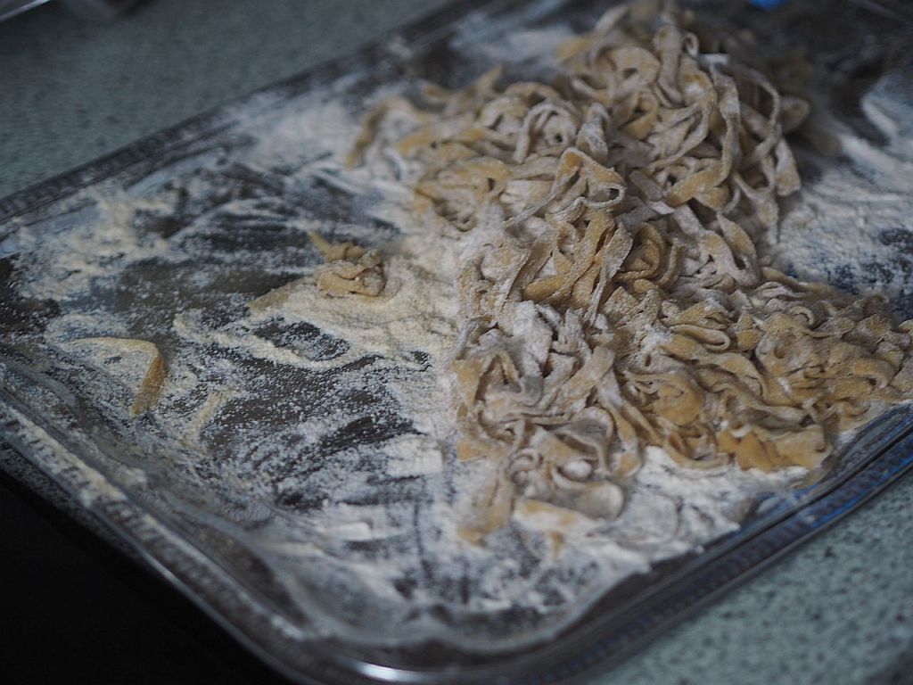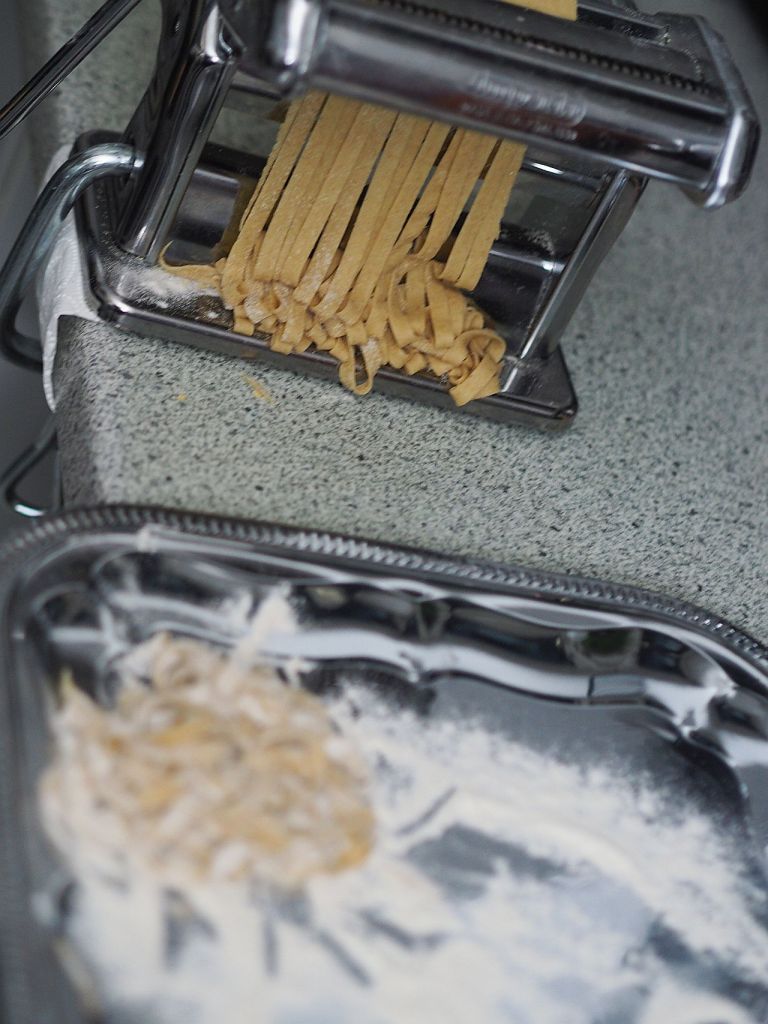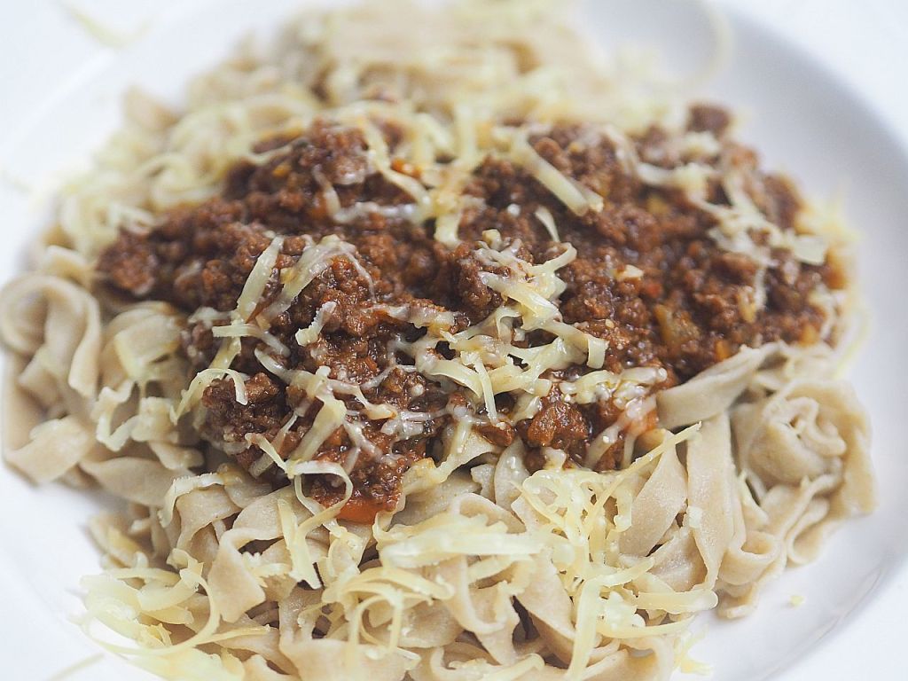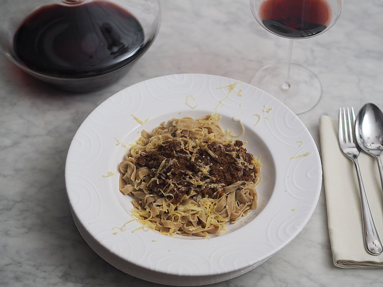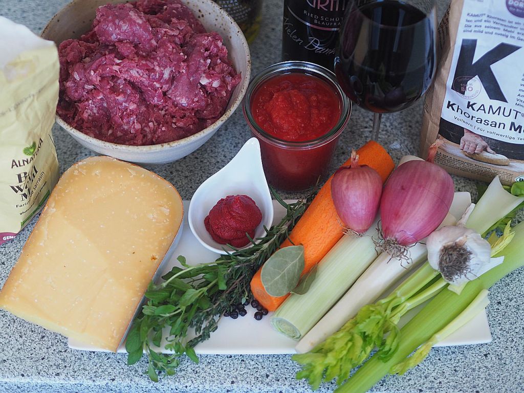 1 große Karotte, ¼ kleiner Sellerie, 3 Stangen vom Stangensellerie, von 1 Lauchstange den weißen Teil, 1 rote Zwiebel, alles klein würfeln. dann in 4 EL Olivenöl das Gemüse anbraten. Wenn alles schön angebraten ist, 1 EL Tomatenmark dazu geben und mitbraten. Währenddessen in einer anderen Pfanne 1 kg Faschiertes gemischt – Reh Wildschwein – in Olivenöl anbraten. Mit einem Glas Rotwein ablöschen. Und alles zum Gemüse geben. Auf mittlerer Hitze zum köcheln bringen, immer wieder mit Rotwein nachgießen, umrühren, bis 1 Flasche Rotwein in einer Dreiviertelstunde eingegossen ist. 400 g Tomatenconcassée dazu geben, salzen. Die gehackten Kräuter Thymian, Rosmarin, Oregano sowie 5 geriebene Knoblauchzehen dazugeben. Zugedeckt 2 h köcheln lassen. K a m u t B u c h w e i z e n n u d e l n 150 g Khorosanmehl, 100 g Buchweizen, 1 Prise Salz, 1 Ei, 80 ml Wasser, 2 EL Olivenöl gut verkneten. Für eine Stunde in Folie eingepackt im Kühlschrank ziehen lassen. Mit der Nudelmaschine Bandnudeln herstellen. In sprudelndem Salzwasser bißfest kochen.