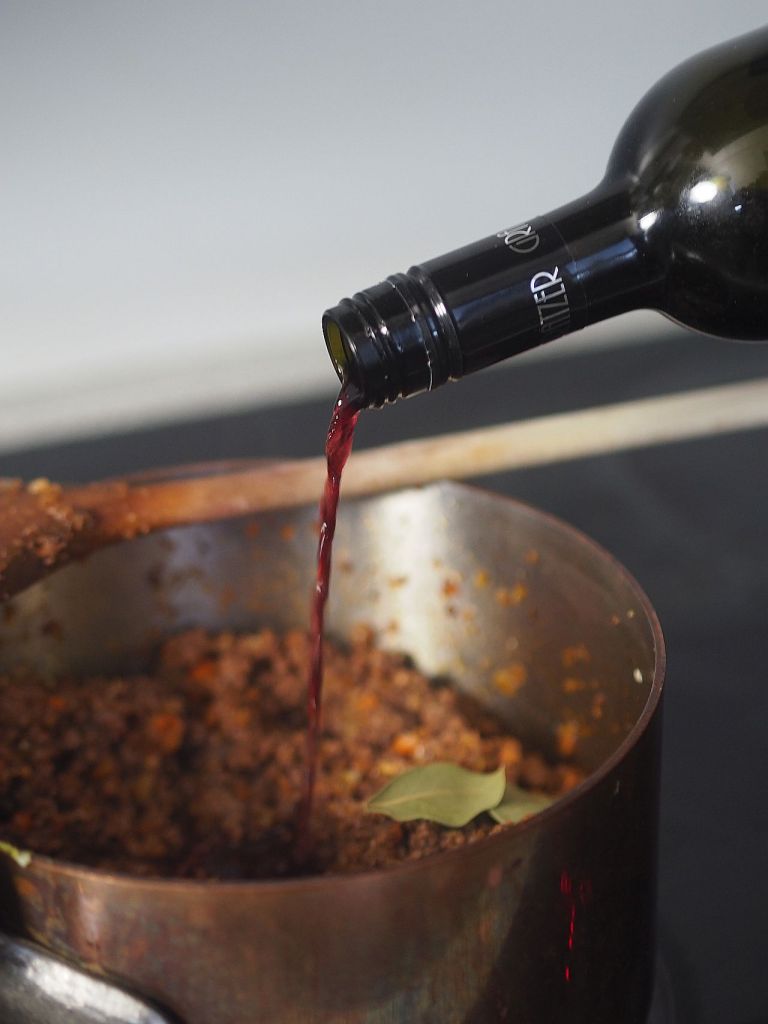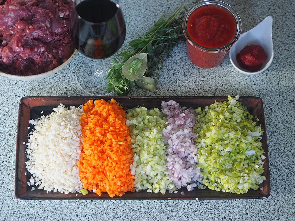 Eine Sauce Bolognese wird mit Rindfaschiertem gemacht, und gart im eigenen Fett. Dafür wäre ein Reh zu mager, so kam uns die Vereinigung mit Wildschein im abholbereiten Faschierten gerade recht.