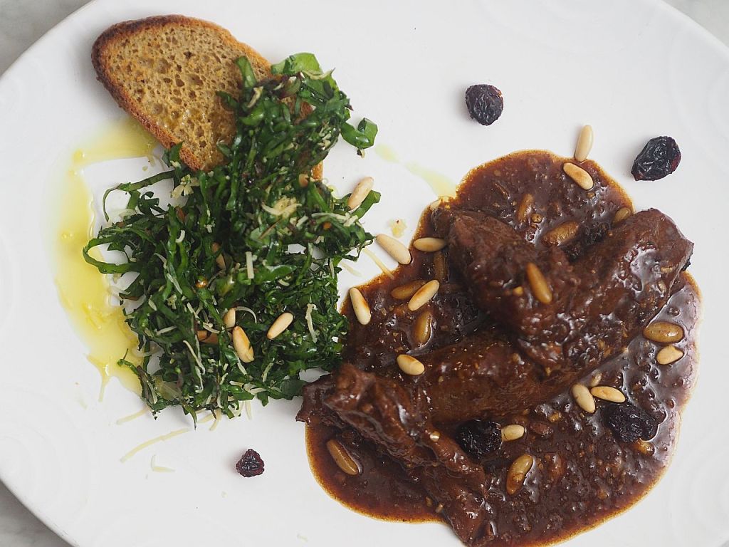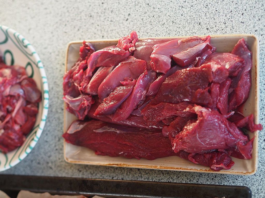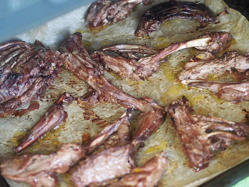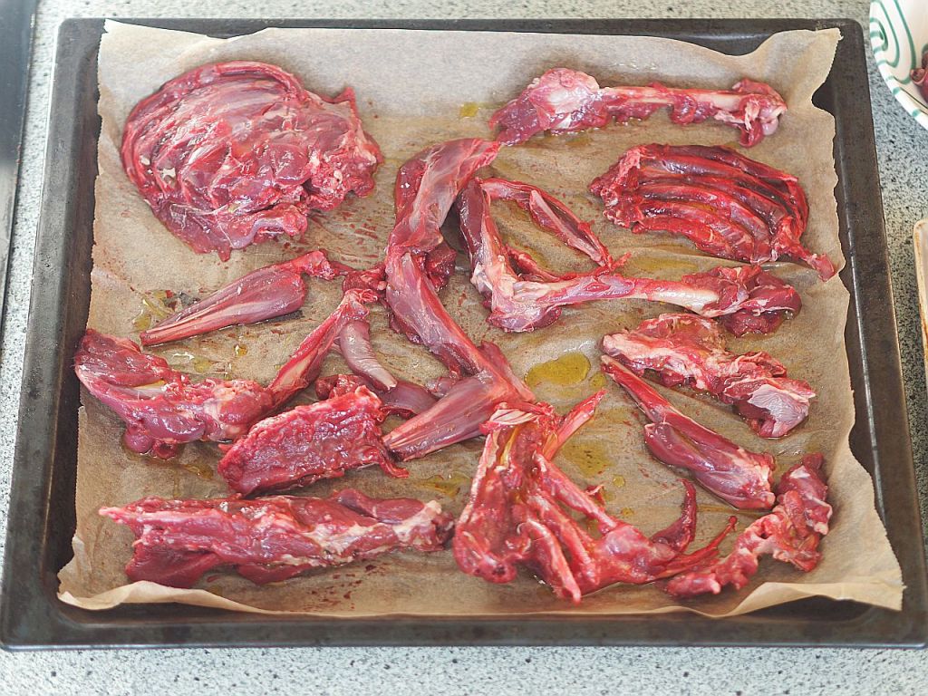 So nah sind wir noch nie an dieses Rezept gekommen. Beim Grabner-Jäger am Markt in Bad Vöslau haben wir einen Hasen im Ganzen bekommen. Und so können wir dieses Mal auch den geforderten Kaninchenjus machen, sowas gibt’s ja nirgends zu kaufen. Ich weiß schon, Hase und Kaninchen sind nicht dasselbe. Aber bei uns gibts halt Hasen und keine Kaninchen. Wie auch andere Zutaten abgetauscht wurden. Statt Rosinen gibt’s Cranberrys und statt Pecorino einen österreichischen Hartkäse vom Schaf. Dieses Rezept hat die Hofköchin schon ein paar Mal gemacht und es hat uns immer geschmeckt. Einmal waren Gäste da, denen hat‘s auch geschmeckt, aber nur so lange bis sie gewußt haben, daß es Hase war. Deshalb macht die Hofköchin das nur mehr für uns zweien.