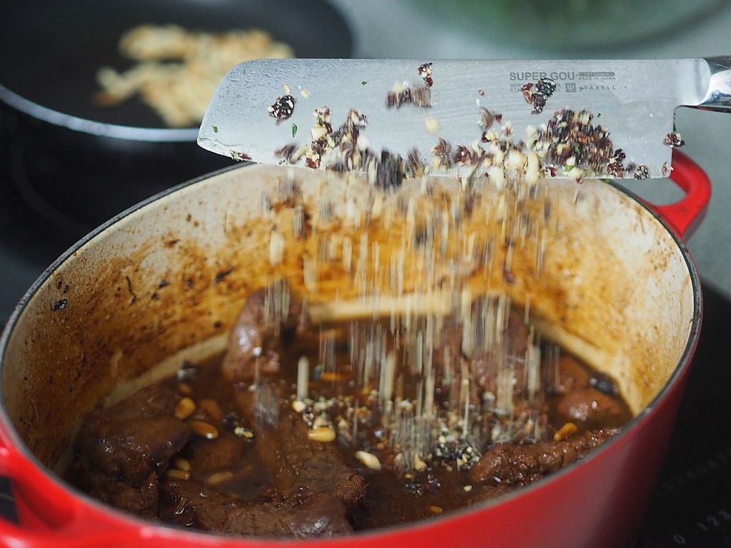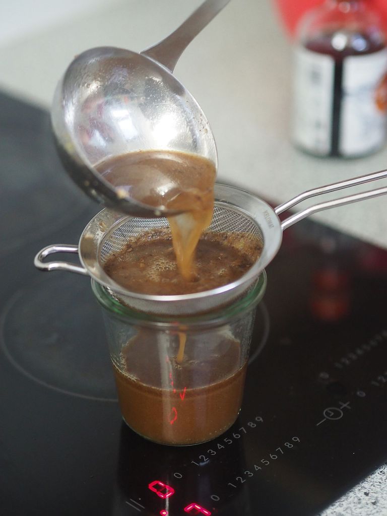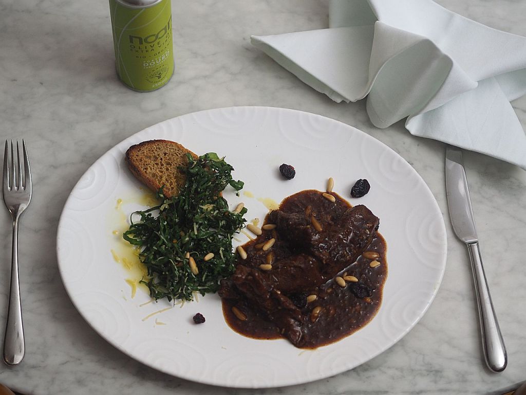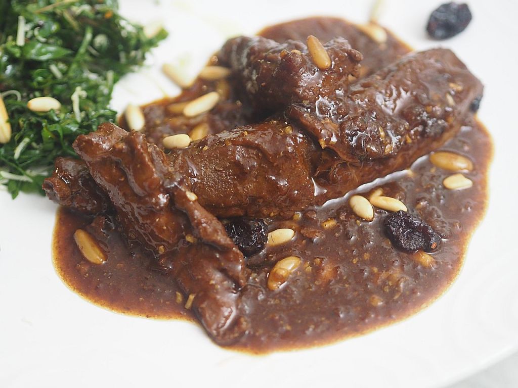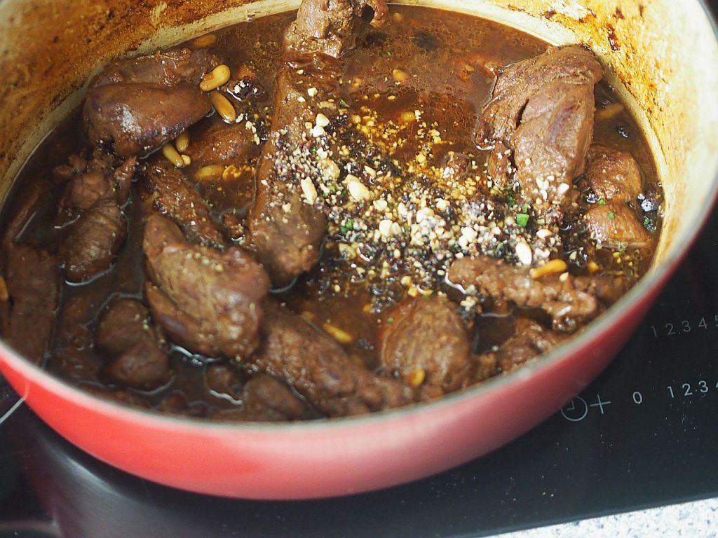 So nah sind wir noch nie an dieses Rezept gekommen. Beim Grabner-Jäger am Markt in Bad Vöslau haben wir einen Hasen im Ganzen bekommen. Und so können wir dieses Mal auch den geforderten Kaninchenjus machen, sowas gibt’s ja nirgends zu kaufen. Ich weiß schon, Hase und Kaninchen sind nicht dasselbe. Aber bei uns gibts halt Hasen und keine Kaninchen. Wie auch andere Zutaten abgetauscht wurden. Statt Rosinen gibt’s Cranberrys und statt Pecorino einen österreichischen Hartkäse vom Schaf. Dieses Rezept hat die Hofköchin schon ein paar Mal gemacht und es hat uns immer geschmeckt. Einmal waren Gäste da, denen hat‘s auch geschmeckt, aber nur so lange bis sie gewußt haben, daß es Hase war. Deshalb macht die Hofköchin das nur mehr für uns zweien.