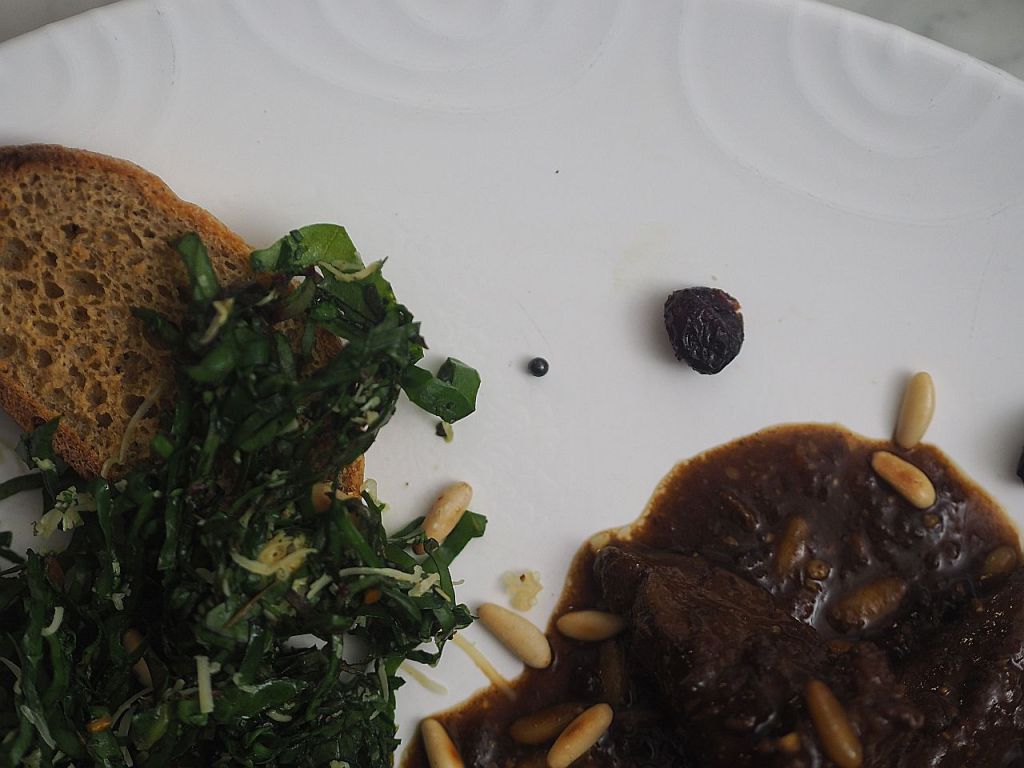 Zuerst einen Hasenjus machen (das Rezept im Grand Livre auf S. 1065 war uns zu kompliziert, hier in vereinfachter Form): 1 kg Hasenknochen und Parüren auf einem mit Backpapier ausgelegten Backblech auslegen und mit Olivenöl beträufeln, darin wälzen. Im Backrohr bei 200°C braten, bis es dunkelbraun ist. In der Zwischenzeit auf dem Herd einen Topf mit Olivenöl erhitzen, das Hasenfleisch hineingeben und bräunen. Dann 1 Tomate, 1 zerdrückte Knoblauch, 1 grob gehackte Zwiebel hineingeben, anbraten, rühren. 15 g Butter hinein, rühren. Die angebratenen Hasenknochen und Parüren dazu geben, das Fett vom Backpapier dazu schütten. Mit Fasanlsuppe auffüllen. Zurückdrehen und zugedeckt Stunden köcheln. H a s e Den ausgelösten Rücken, Schulter und Hachse in Olivenöl anbraten. 4 klein gehackte Schalotten dazugeben, mitanbraten. Mit 2 EL Balsamico-Rotweinessig ablöschen, kurz einköcheln, 2 Schluck Madeira dazu und einköcheln. Den Jus dazu gießen.2 EL angeröstete Pinienkerne und 1 EL getrocknete Cranberry dazugeben, salzen. 30 Min. zugedeckt bei 160°C den Hasen schmoren. I n d e r Z w i s c h e n z e i t die Mangoldblätter waschen und trocken schleudern. Den Strunk entfernen, zusammenrollen und in dünne Streifen schneiden. Thymian, Rosmarin, Majoran fein hacken, zu den Mangoldstreifen geben. Gereiften Bergkäse fein reiben, unter den Mangold heben. Vor dem Servieren mit Salz und Olivenöl abschmecken. F ü r d i e S o ß e: einen großen EL Pinienkerne und ebenso einen großen EL Cranberry miteinander mit einem Wiegemesser zerhacken. Das Fleisch aus dem Backrohr nehmen, die Pinienkerne-Cranberry-Mischung dazu geben. Auf dem Herd aufkochen und binden. Mit geröstetem Kamutbrot servieren.