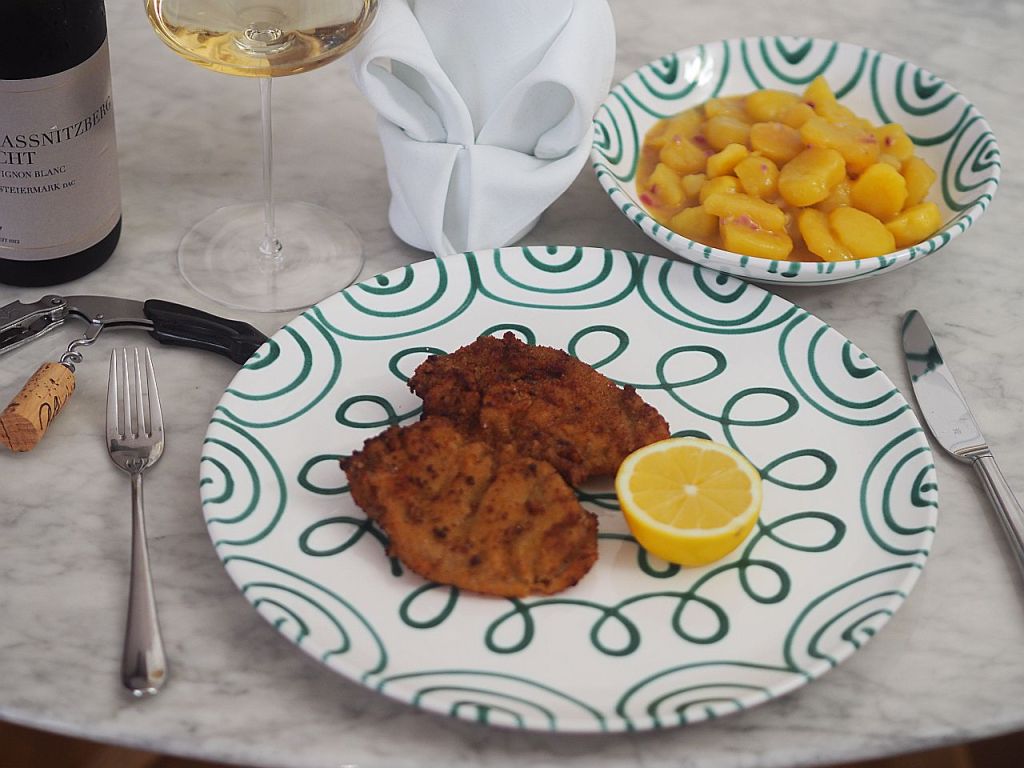 Das Wiener Schnitzel beim Wirten hat mir nicht zugesagt. Lange waren wir nicht dort. Der Wirt war gut aufgelegt, wie eh und je: „Wie geht’s?“ „Danke gut. Und selber?“ „Jeden Tag im Wirtshaus…“ mit einer Geste, wie solls mir da schon gehen? Gut natürlich. Der Wirt war immer noch der Alte, aber die Schnitzeln waren es nicht, die haben nicht convenirt. Aber was hat sich geändert? Jedenfalls war‘s mir nach einem Antidot zumute und so gibt es nun ein Wiener Schnitzel mit Kartoffelsalat, ausnahmsweise zu Hause. Die Küchenfee macht’s möglich.