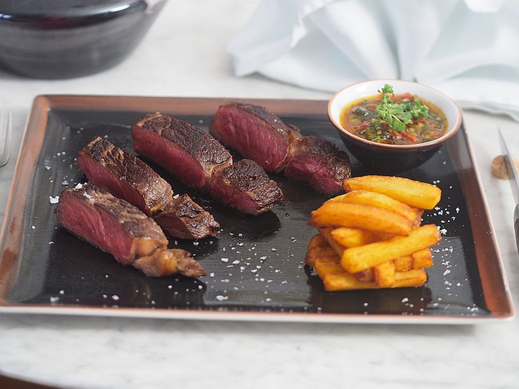 Wir haben ein Steak, da steht drauf XO, weil das von alten Kühen ist. Nachdem sie ihr Leben lang auf der Weide gestanden sind und Milch gaben, hat man sie in Pension geschickt. Gibt’s nicht überall. Vielleicht können wir das nach Argentinien exportieren, jetzt wo das MERCOSUR-Abkommen besiegelt ist? Das wird ein Geschäft! (Oder wir behalten es für uns, und verzichten auf das Fleisch aus Südamerika.)