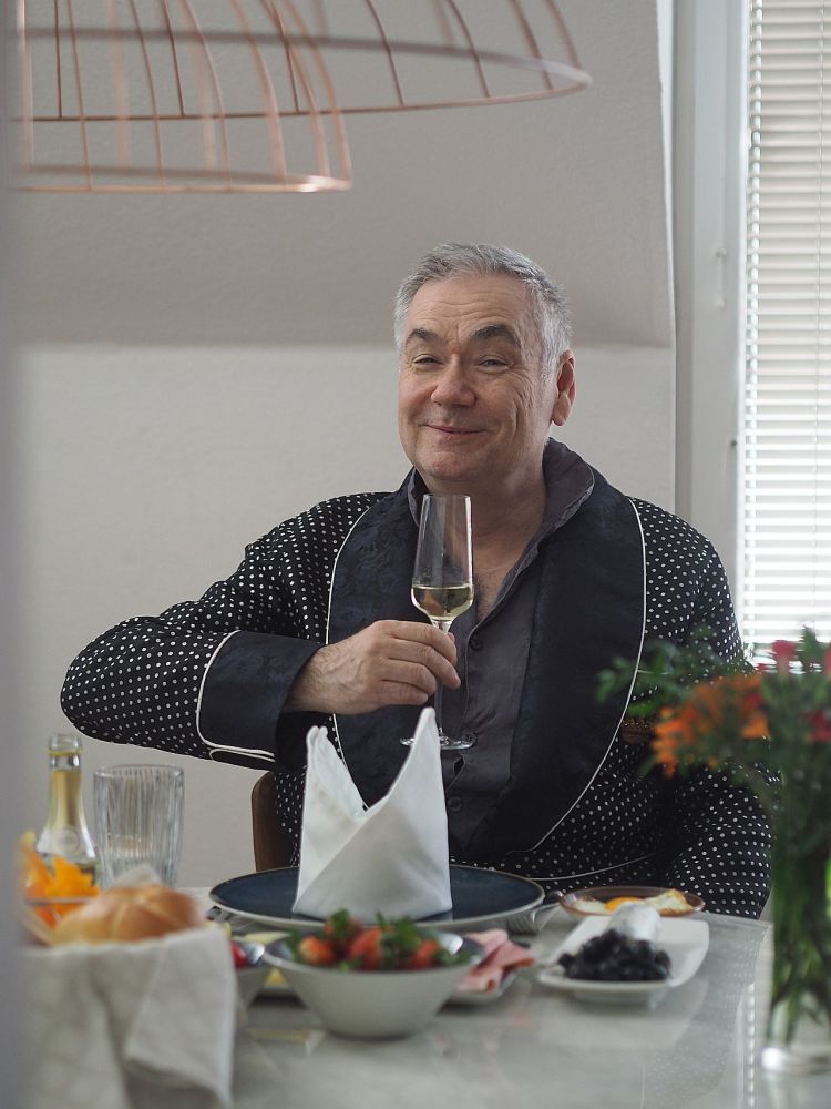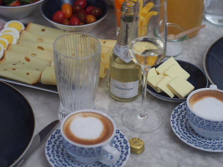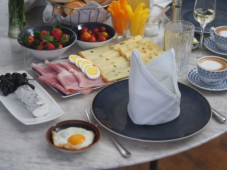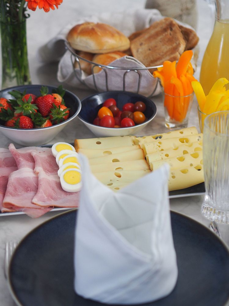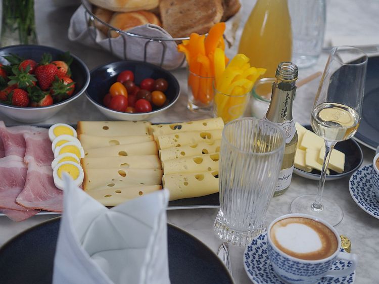 Wwurm Apfel-Basilikum-Limette-Saft, griechische Erdbeeren, Cherry-Tomaten, Paprika geschnitten, Esterhazy Eier gekocht, Schärdinger Bergbaron, geräuchert, SalzburgMilch Almkönig Emmentaler, Schlumberger Piccolo-Sekt „Austrian Sparkling“, Butter, Kaffee s. Passalacqua Cremador, Napoli
