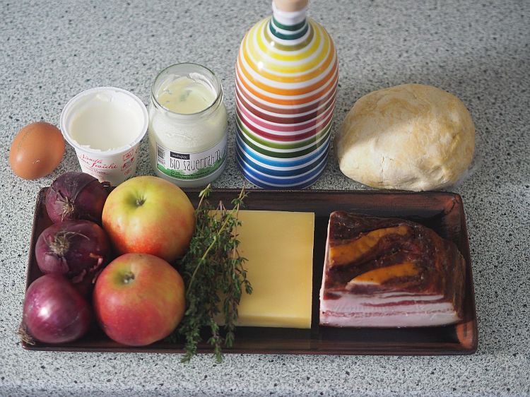 Fülle: 3 rote Zwiebeln, 2 große säuerlich schmeckende Äpfel (Elstar), 4 Scheiben Mangalica-Speck, 1 halben Bund Thymian, 2 EL Olivenöl