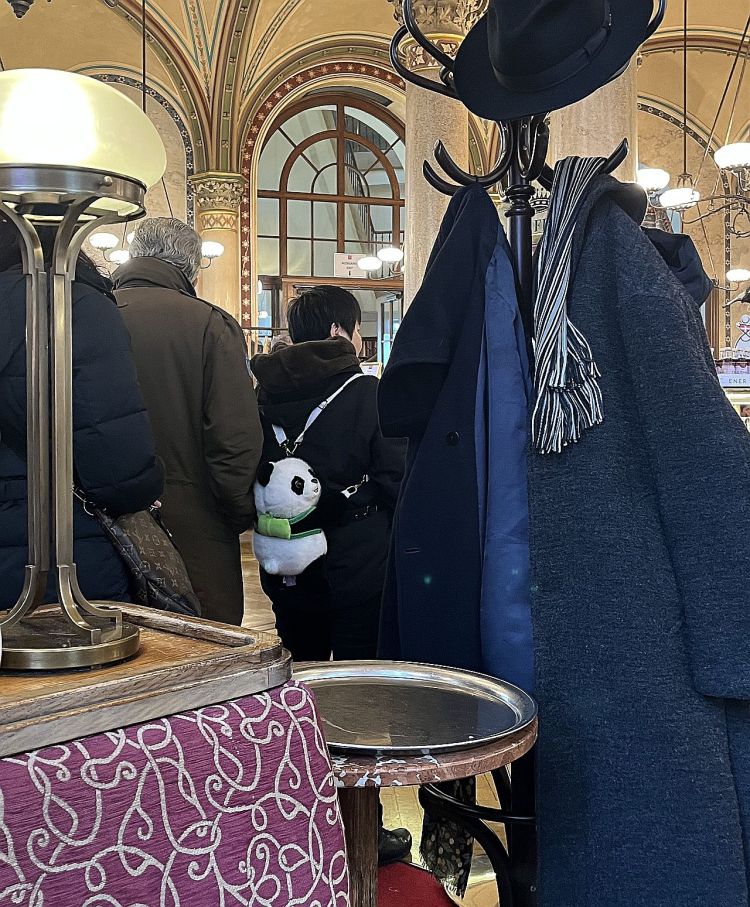 Im Café Central. Eine Chinesin mit Panda wartet auf die Platzzuweisung.