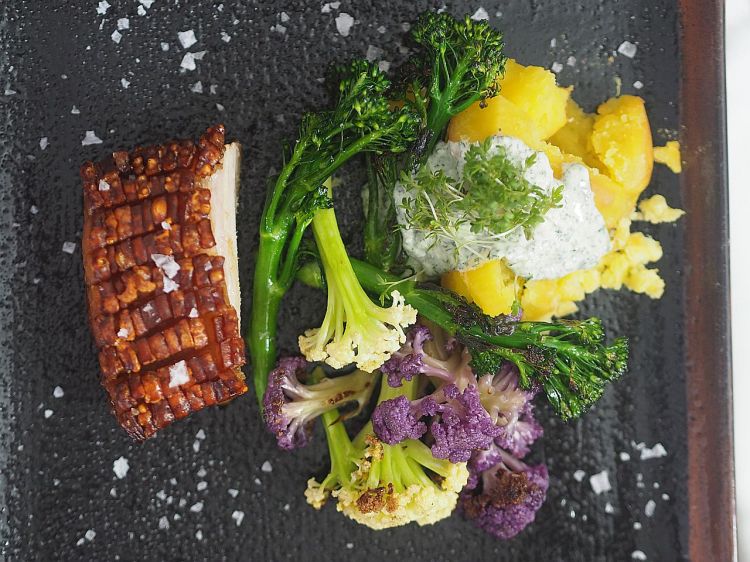 Schweinsbraten mit Wild-Brokkoli, Wild-Karfiol und Kartoffeln mit Kräutertopfen