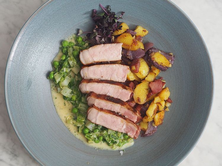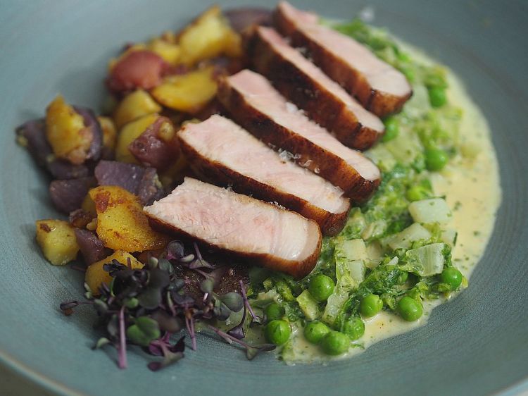 Zutaten: 460 g Duroc-Freilandschwein DRY AGED T-Bone Steak, 1 Kohlrabi, 1 kleine Zwiebel, etwas Butter, 1 EL Kamutmehl, 200 g TK-Erbsen, 30 ml Sahne,1 Kochsalat, ein 50g Packerl Grüne-Soße-Kräutermischung (Petersilie, Dille, Kresse, Kerbel, Schnittlauch, Sauerampfer, Boretsch, Pimpernelle), Wasser, Salz