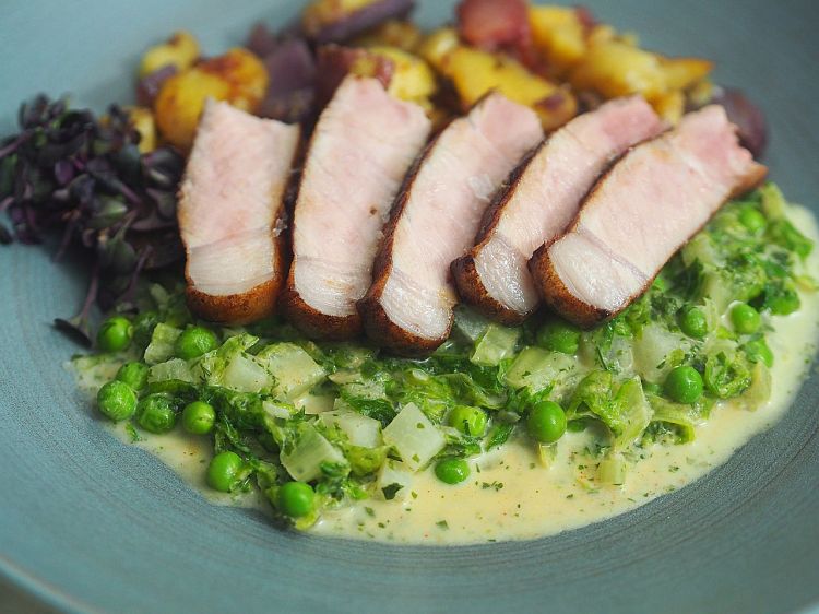 In einem Topf die feingehackte Zwiebel in Butter anschwitzen. Kohlrabi schälen und in Würfel schneiden, in der Größe der Erbsen. Zu den Zwiebeln geben. Kurz mitschwitzen. Ein EL Kamutmehl hineingeben. Das ergibt eine Kohlrabi-Mehlschwitze. Wie Mehlschwitze anbraten. Die Sahne dazugeben und mit ca. 300 ml Wasser aufgießen. Die TK-Erbsen und den in der Zwischenzeit in feine Scheiben geschnittenen und blanchierten Kochsalat hineingeben. Kurz köcheln lassen. Mit Salz abschmecken. Zum Schluß die Kräutermischung einrühren. Parallel dazu das Schweinefleisch ohne Zugabe von Fett oder Öl in der Pfanne beidseitig braten. Dann die Pfanne auf die Seite geben und das Schweinefleisch im Backrohr bei 120°C durchgaren. Das vom dem Fleisch ausgelassene Fett in der Pfanne erhitzen und darin die gekochten, in Scheiben geschnittenen Erdäpfel anbraten. Salzen. Fertig.