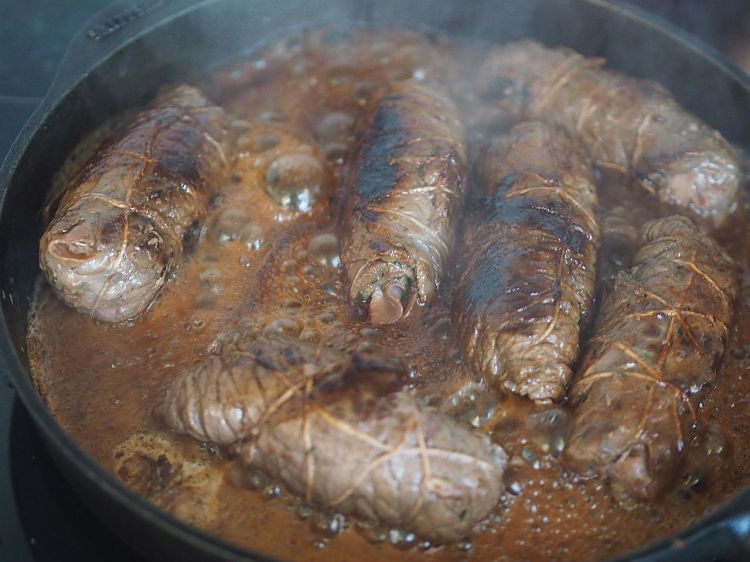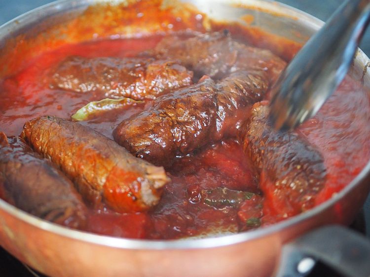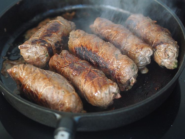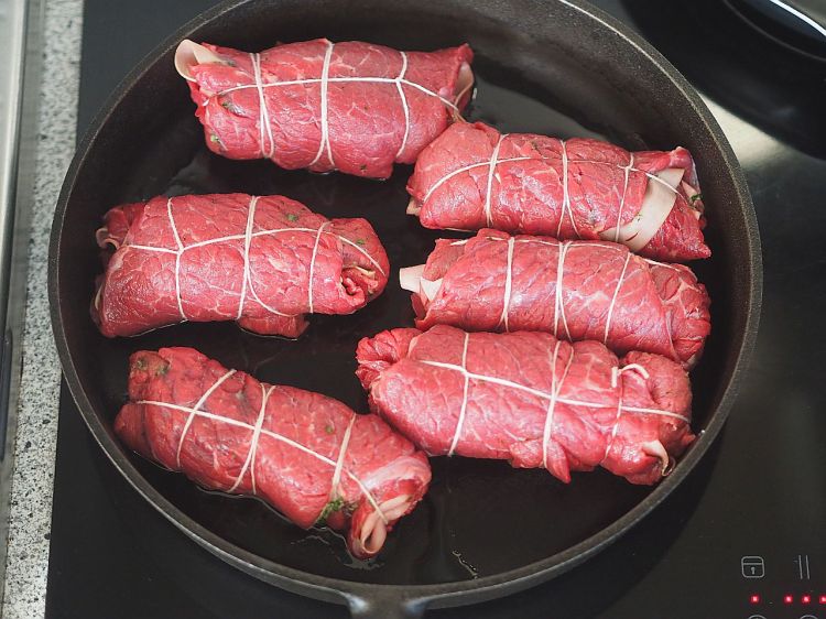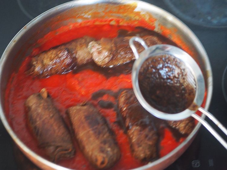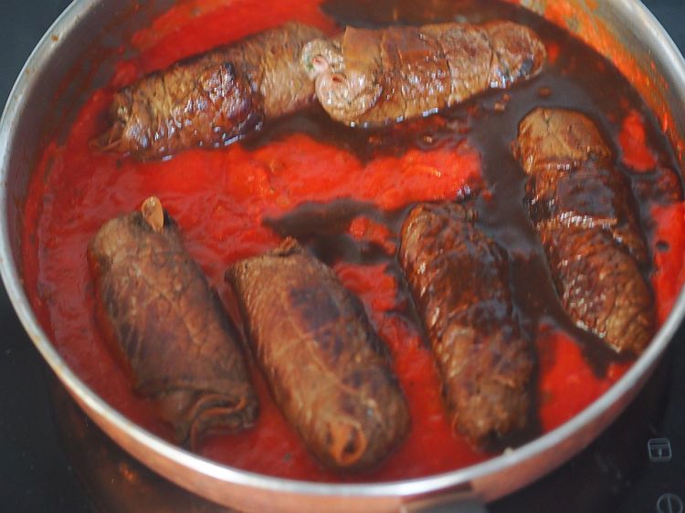 Angelehnt an ein Rezept von Fabio Picchi, Florence Walking through Food and Culture, 2015, S. 179 “BEEF ROLLS”. Dort ist es auf Englisch in einem lockeren Stil beschrieben. Close this „little suitcase“ with the help of two little toothpicks a.s.o.