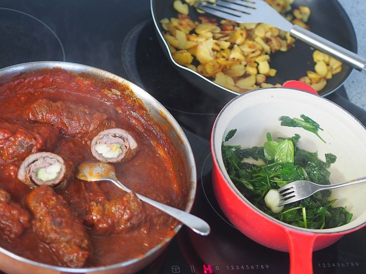Die gehackte Petersilie, mit 7 geriebenen Knoblauchzehen, Zesten von den Zitronen, Salz und Olivenöl zu einer Paste verrühren. Die Schnitzeln mit dem Plattiereisen glätten, salzen und die Paste darauf verteilen. Mit Mortadella belegen und halbierte Artischocken darauf legen (3 halbe pro Schnitzel). Aufrollen. Mit Küchengarn zusammenbinden. In der Pfanne mit wenig Olivenöl rundum anbraten. Gleichzeitig die fein gehackte violette Zwiebel in 2 EL Olivenöl anschwitzen, mit Tomaten-Pulpa aufgießen. 2 geriebene Knoblauchzehen, Salbeiblätter, Lorberblätter, gehackten Thymian und Salz dazu geben und leise köcheln lassen. Wenn die Rindsroulade rundum schön angebräunt ist, mit Madeira ablöschen. Auf die Seite stellen, von den Rindsrouladen den Garn entfernen, und die Rouladen zum Tomatenpulpa geben. Den Madeira und den Bratensatz in der Bratpfanne durch ein Sieb zur Tomatensoße gießen. Zusammenrühren. Zugedeckt die Rindsrouladen weich garen. In der Zwischenzeit wenig Olivenöl in einer Pfanne erwärmen. Die Spinatblätter hinein geben und mit einer Knoblauchgabel verrühren, sodaß die Spinatblätter zusammenfallen. Gekochte Erdäpfeln schälen und in dünne Scheiben schneiden und in der Bratpfanne anbraten. Servieren.