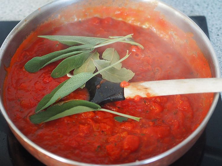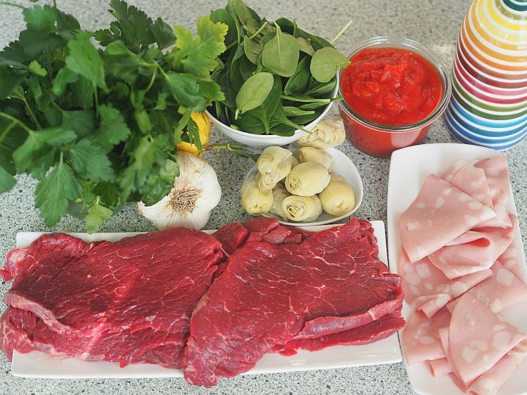 1 kleiner Bund Petersilie, 10 Knoblauchzehen, 2 Amalfi-Zitronen, Salz, Olivenöl, 6 Schnitzeln (Angus), 10 dkg Mortadella, 9 eingelegte Artischocken, 1 violette Zwiebel, 700 g Tomaten-Pulpa, 5 Salbeiblätter, 2 Lorbeerblätter, ein paar Zweige Thymian, Madeirawein, 200 g Baby-Spinatblätter, 2 kg Valdivia Kartoffeln, Küchengarn