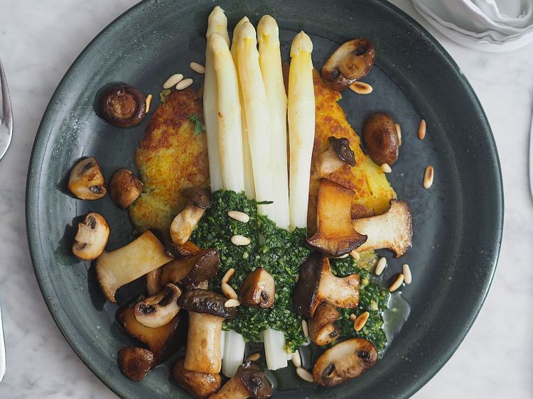 Spargel mit Bärlauch-Pesto, gebratenen Pilzen und Erdäpfelgröstl