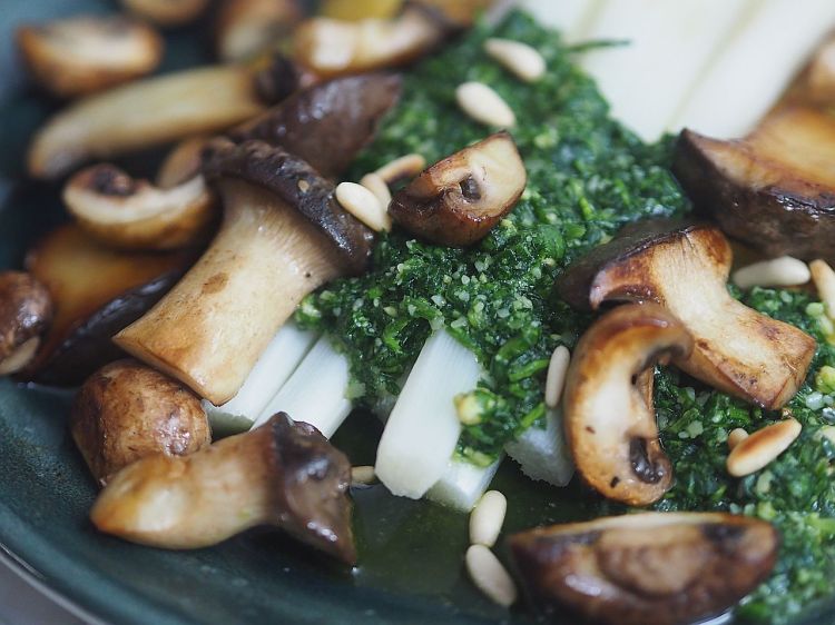 Der saftige Spargel frisch und zart. Dazu frühlingsfrisches Bärlauch-Pesto. Die gerösteten Pilze. Auf leuchtend gelbem Erdäpfelgröstl. Das sind wirklich Frühlingsboten.