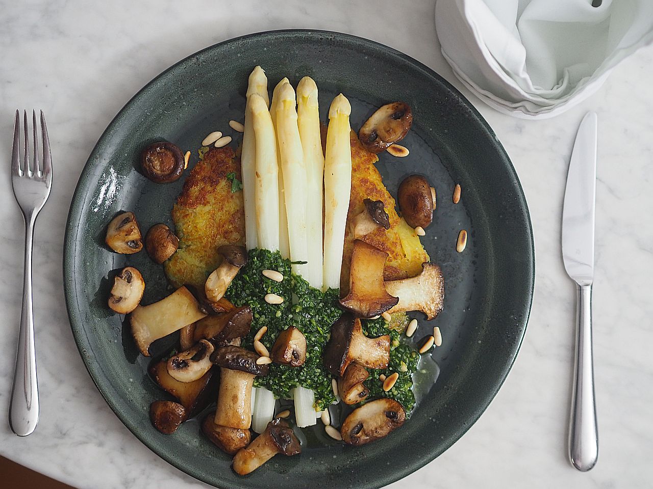 Spargel mit Bärlauch-Pesto, gebratenen Pilzen und Erdäpfelgröstl