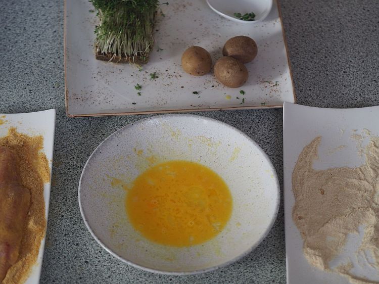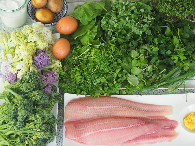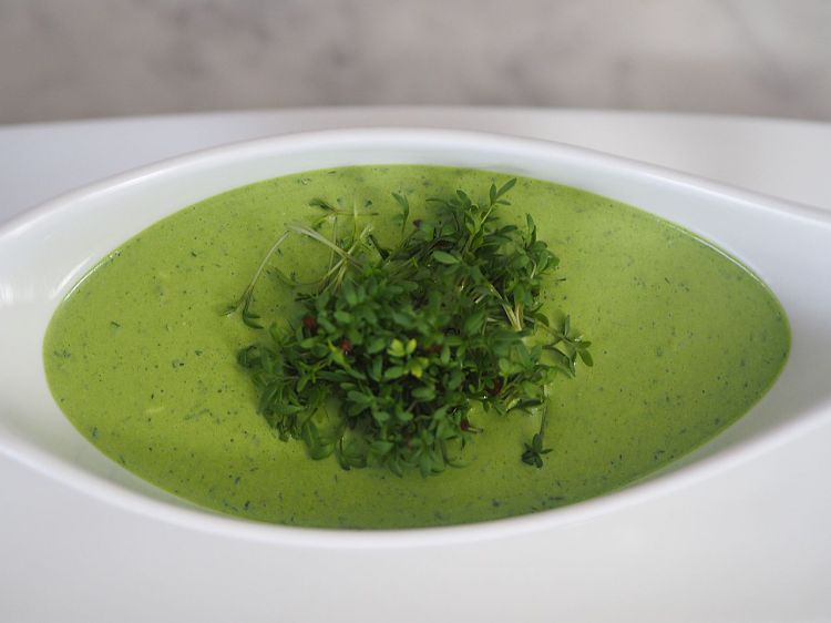 Die Kräuter (ca. 200 g): Petersilie, Kerbel, Kresse, Boretsch, Brunnenkresse, Pimpinelle und Schnittlauch, 200 g Schmand, 250 g Topfen, 1 EL mittelscharfer Senf, 1 EL Weißweinessig, 2 Eier, 2 EL Olivenöl, Salz